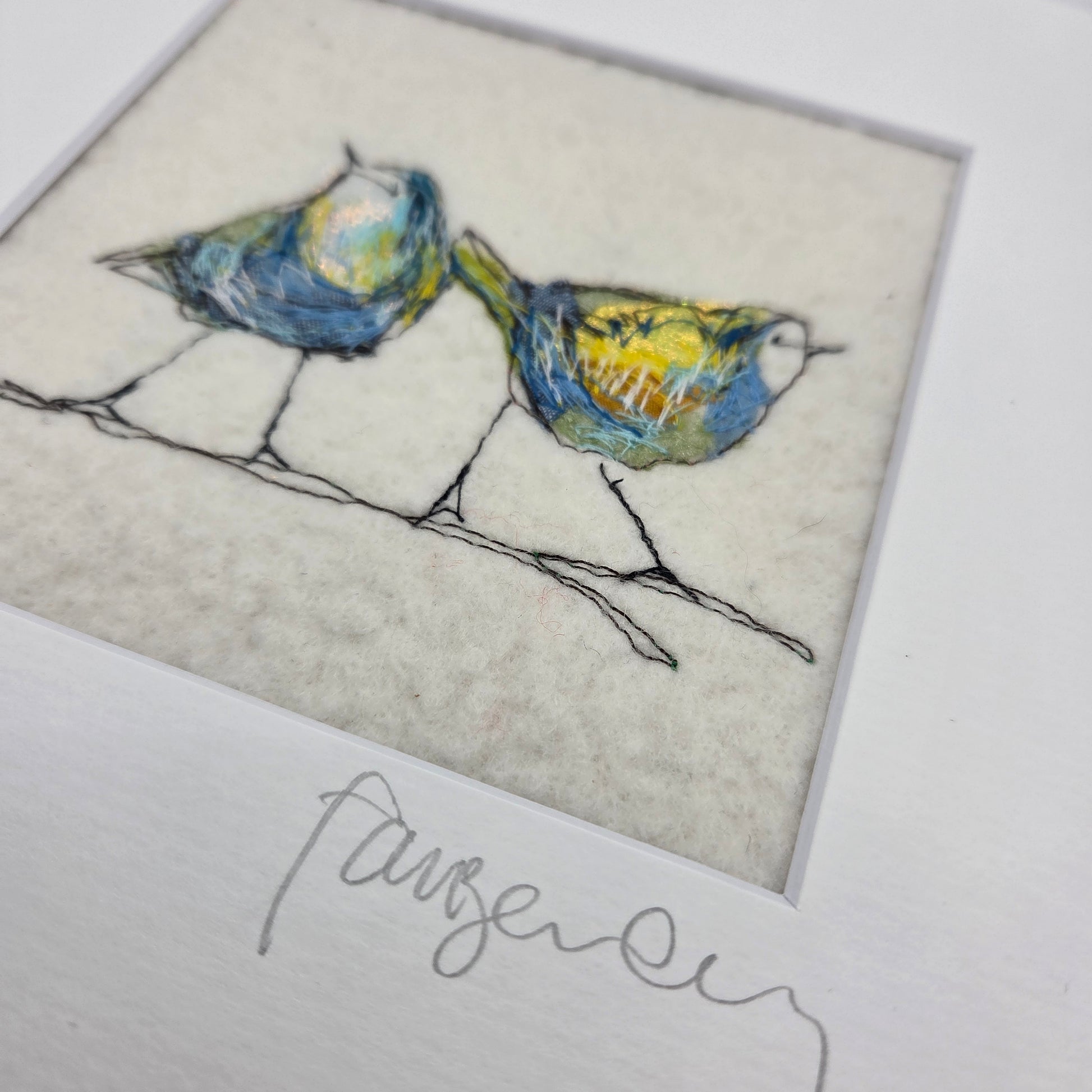 Hand made woollen wet felt textile art. I use silks and tweeds to collage the whimsical imagery, here two blue birds, Peter and Paul stand on a wire.