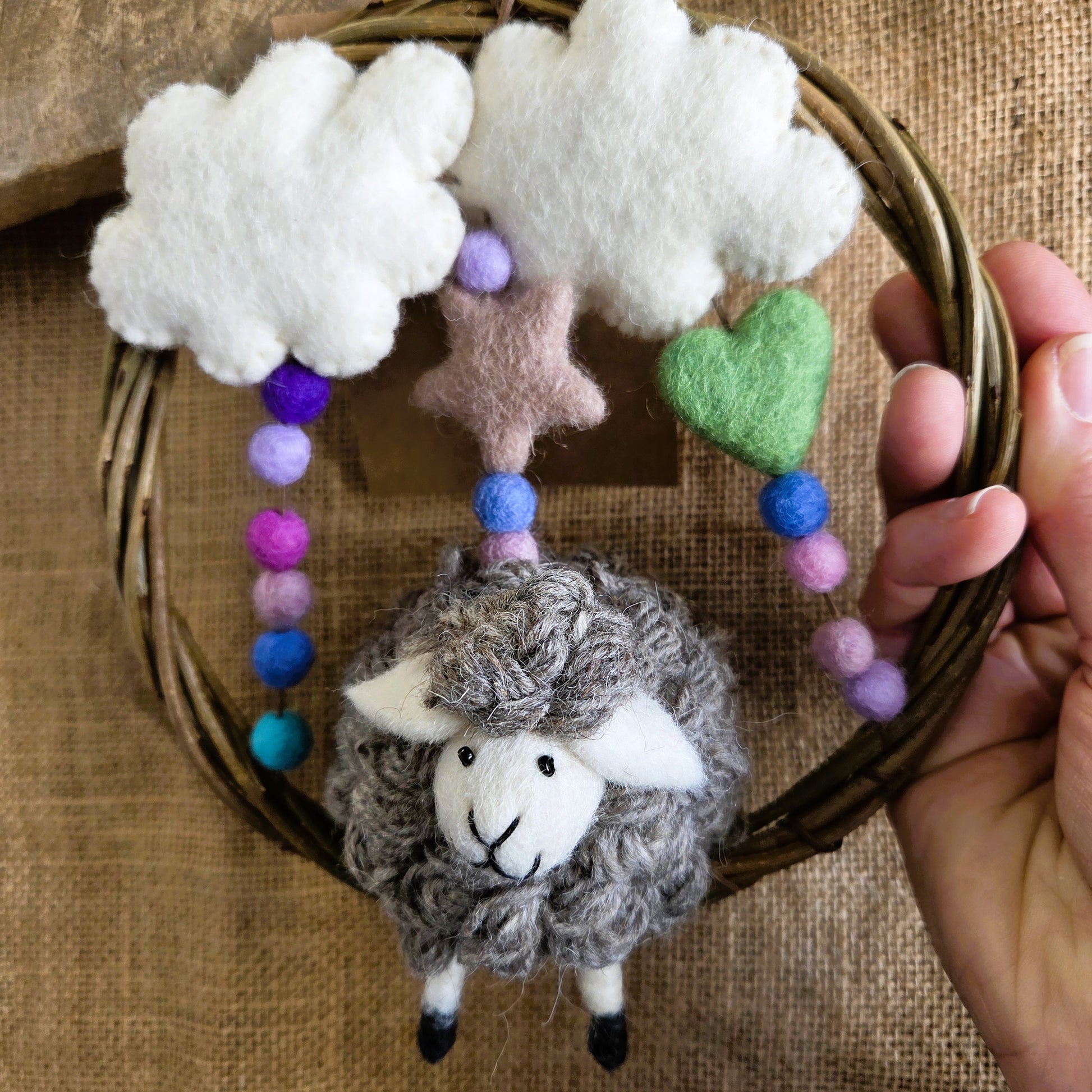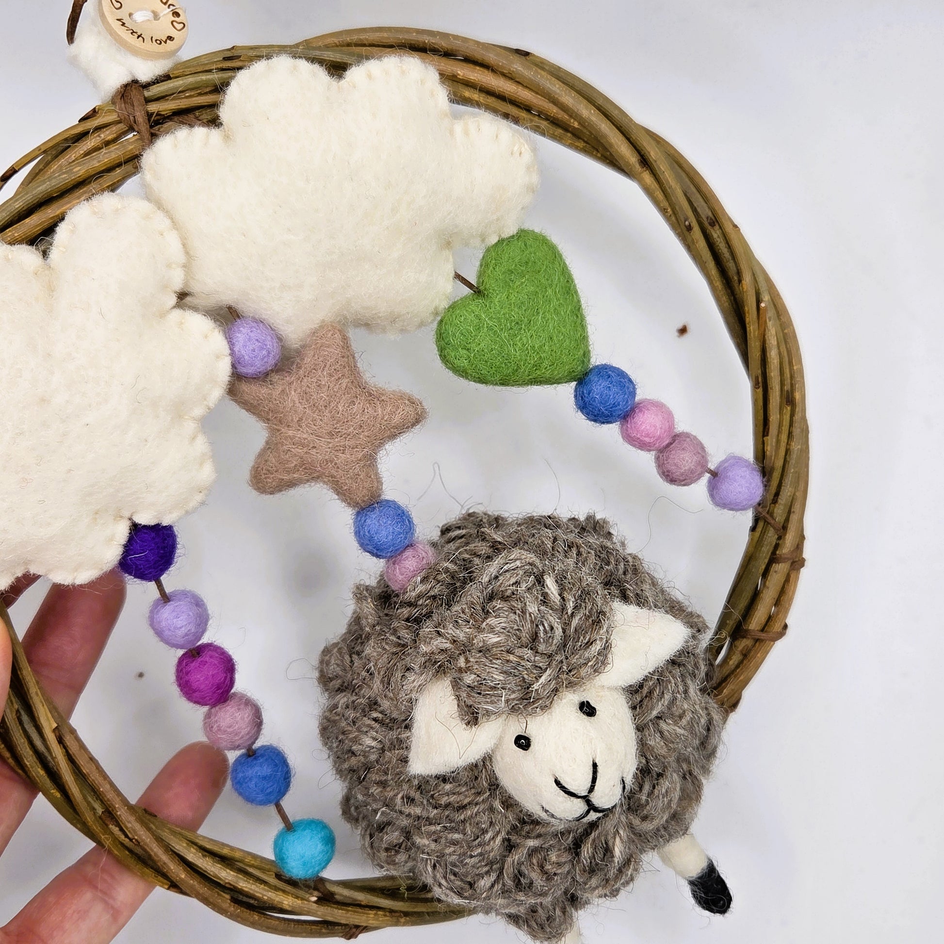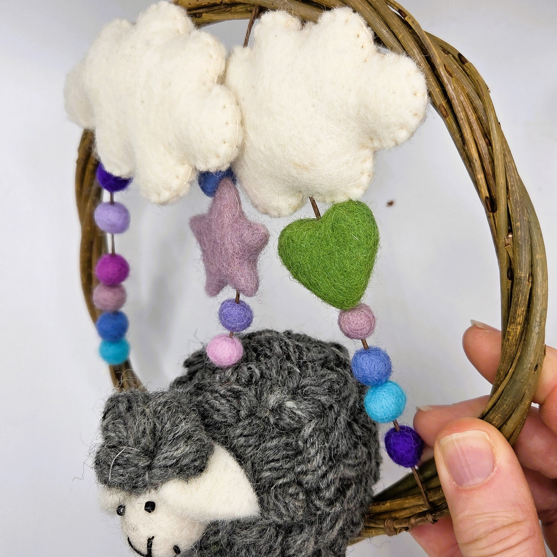 A gentle guardian for sweet dreams, this dreamcatcher is handwoven from Irish-grown willow, forming a natural wreath full of rustic charm. Celebrate a new Baa-Baa Surrounded by floating pastel stars of 100% wool and a woollen hand crafted sheep.