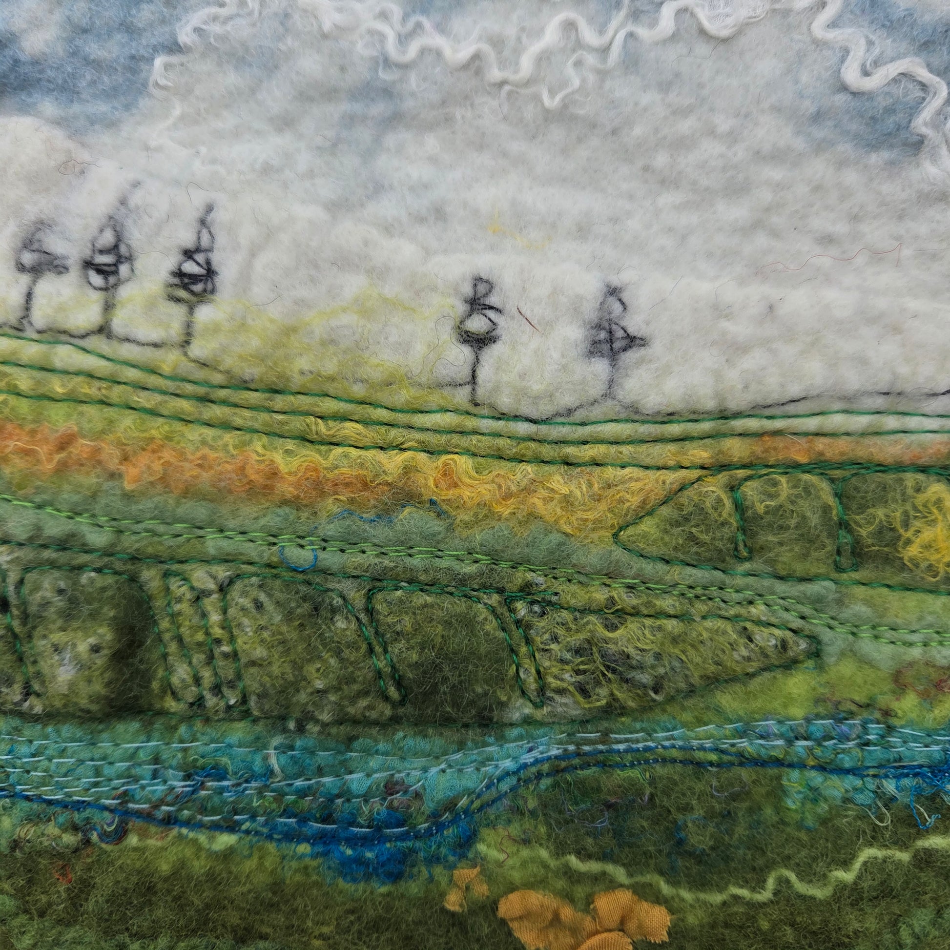 Inspired by the shifting horizons of the Irish countryside. These scenes are created using the wet felting technique, integrating natural wool, cotton, threads, silk, and Irish wool tweeds to echo the land’s rich textures and tones.