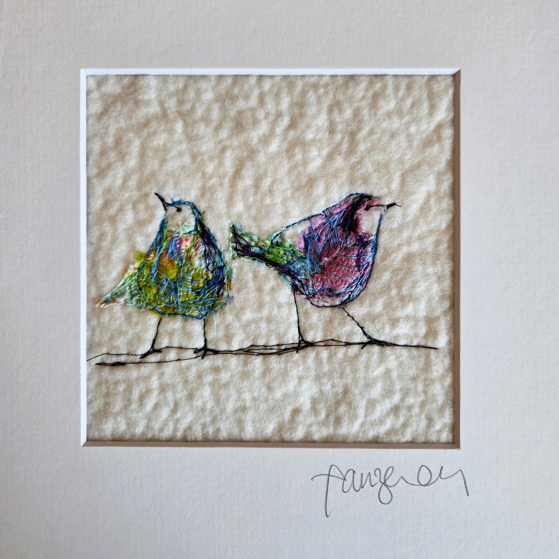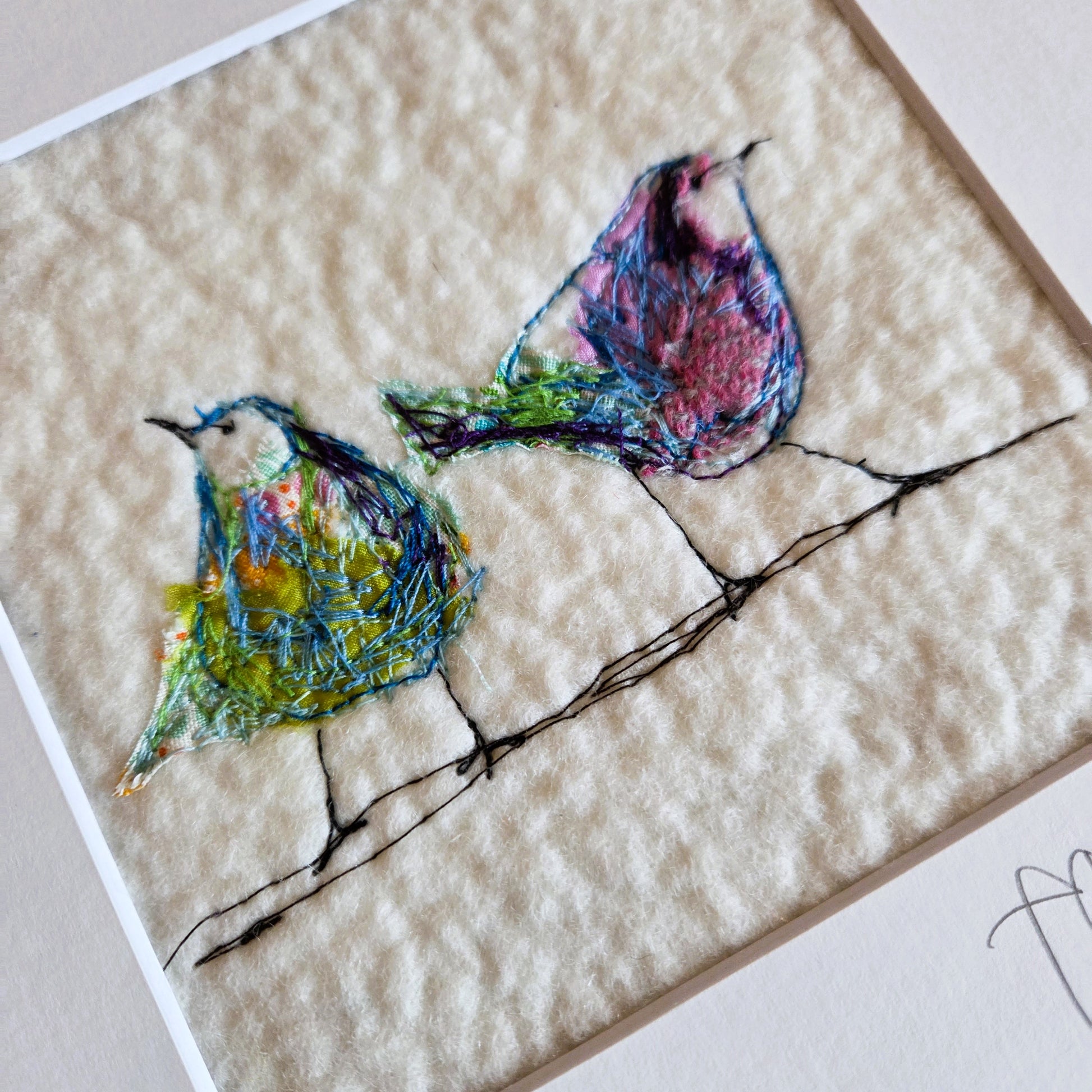 Hand made woollen wet felt textile art. I use silks and tweeds to collage the whimsical imagery, here two exotic birds share some tweets.