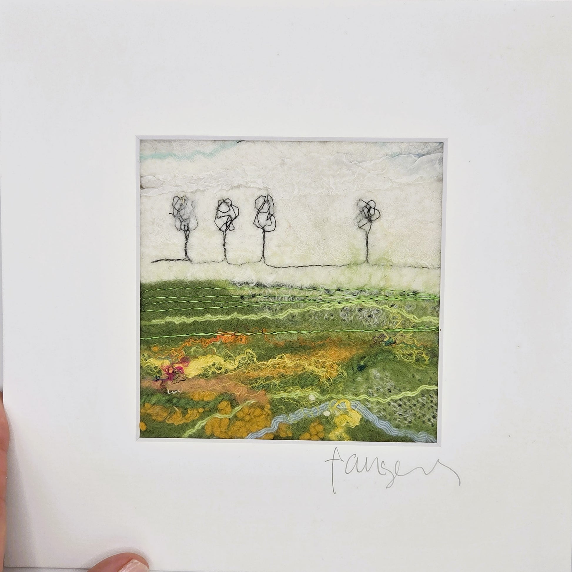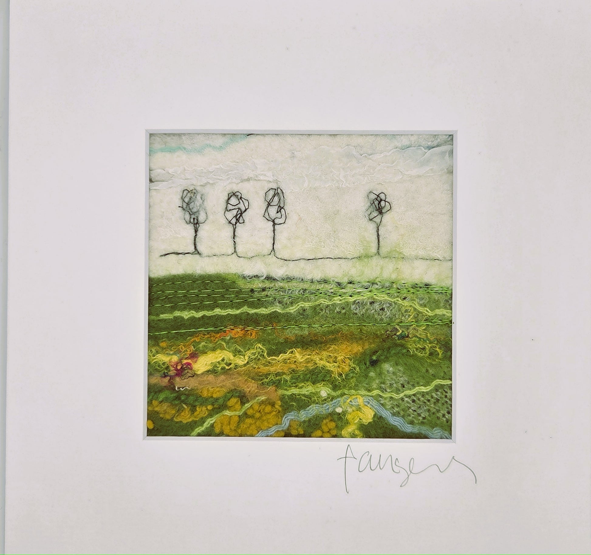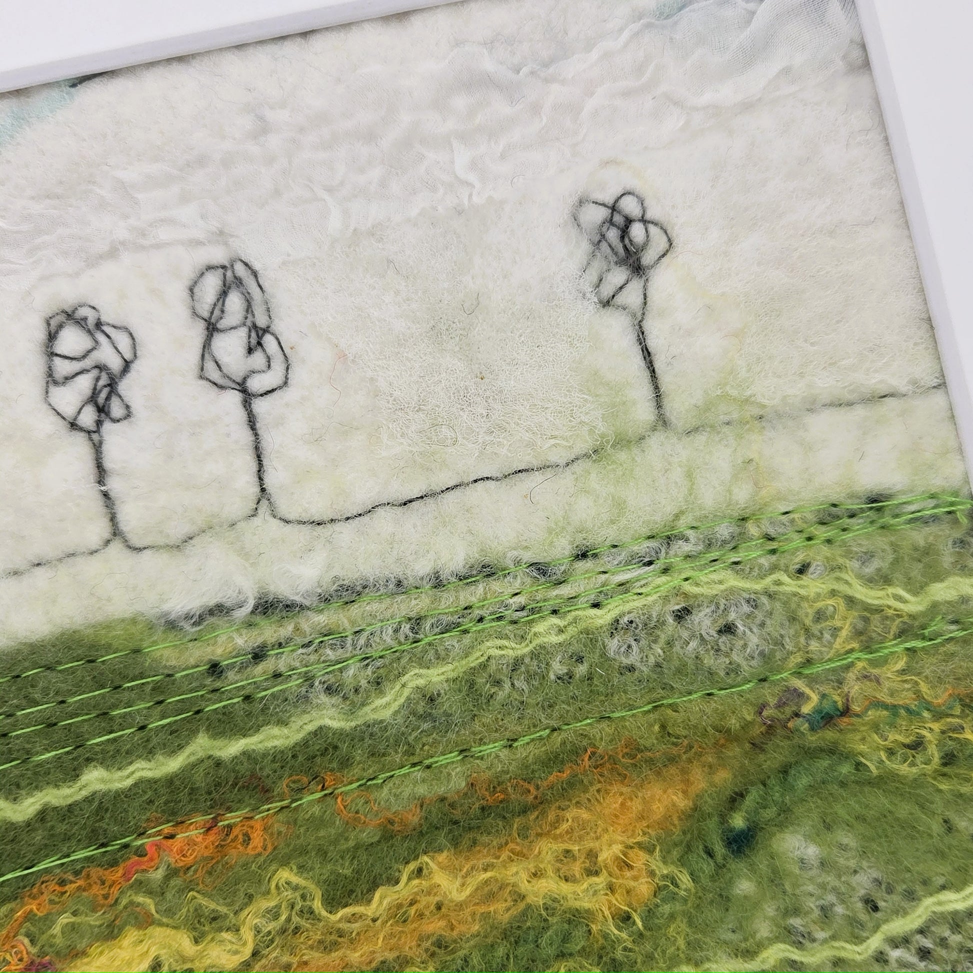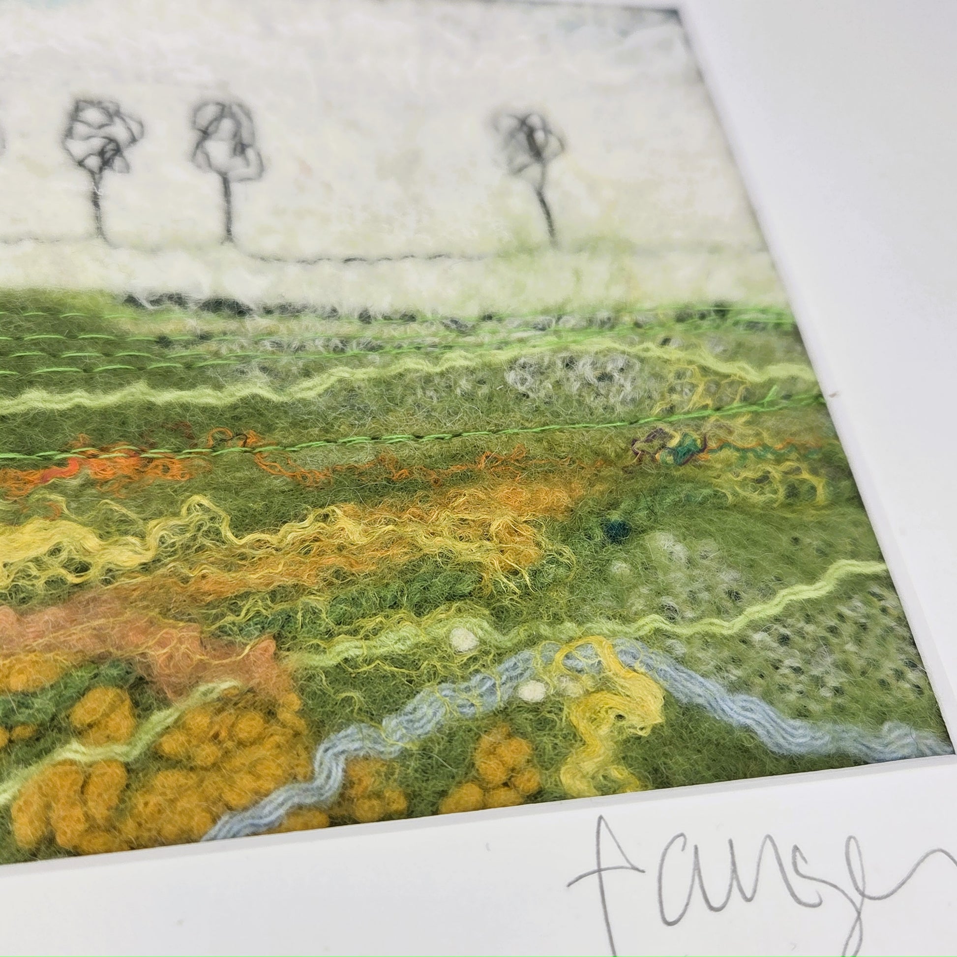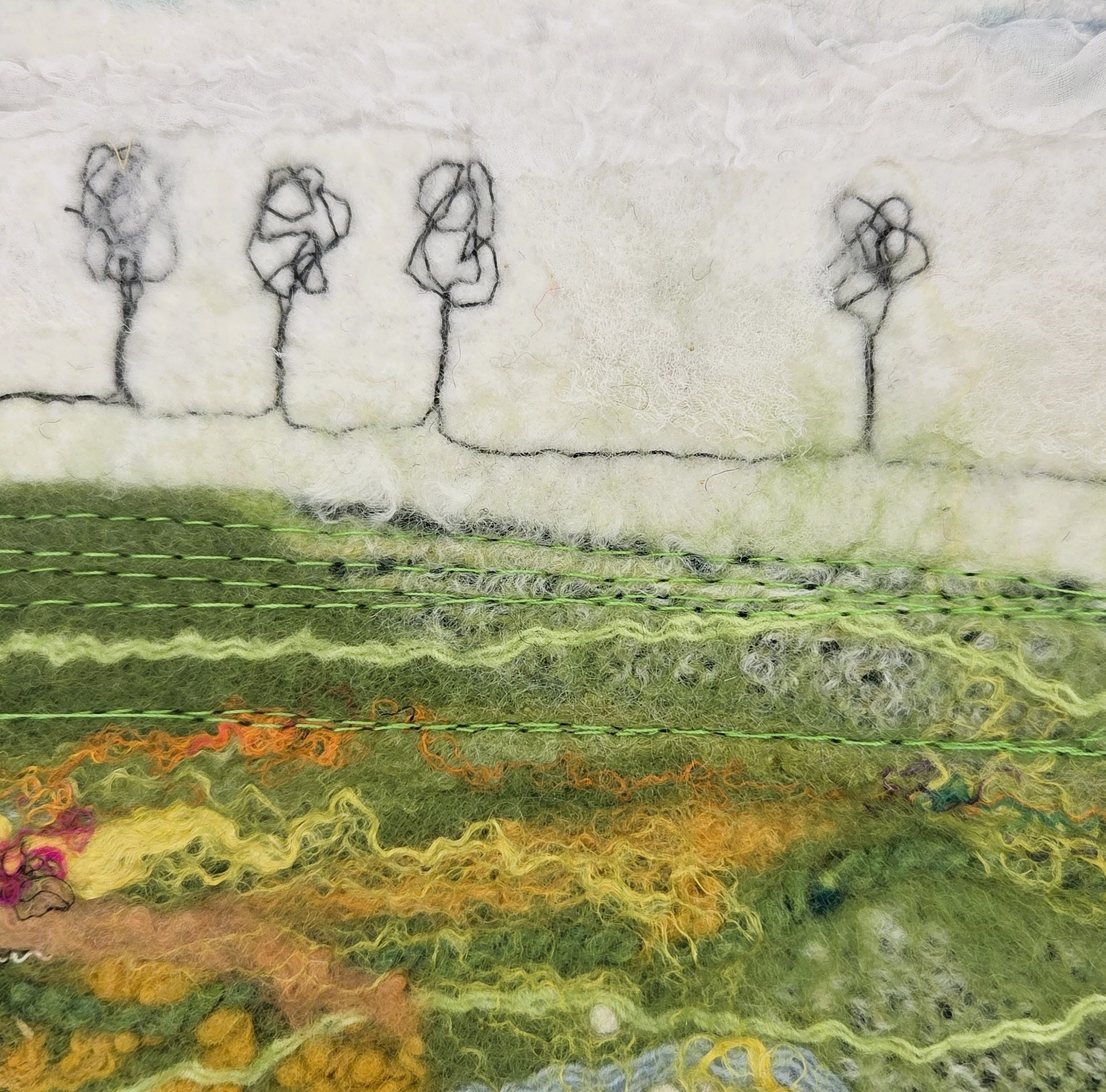 Inspired by the shifting horizon of County Kildare, these scenes are created using the wet felting technique, integrating natural wool, cotton, threads, silk, and Irish wool tweeds to echo the land’s rich textures and tones.