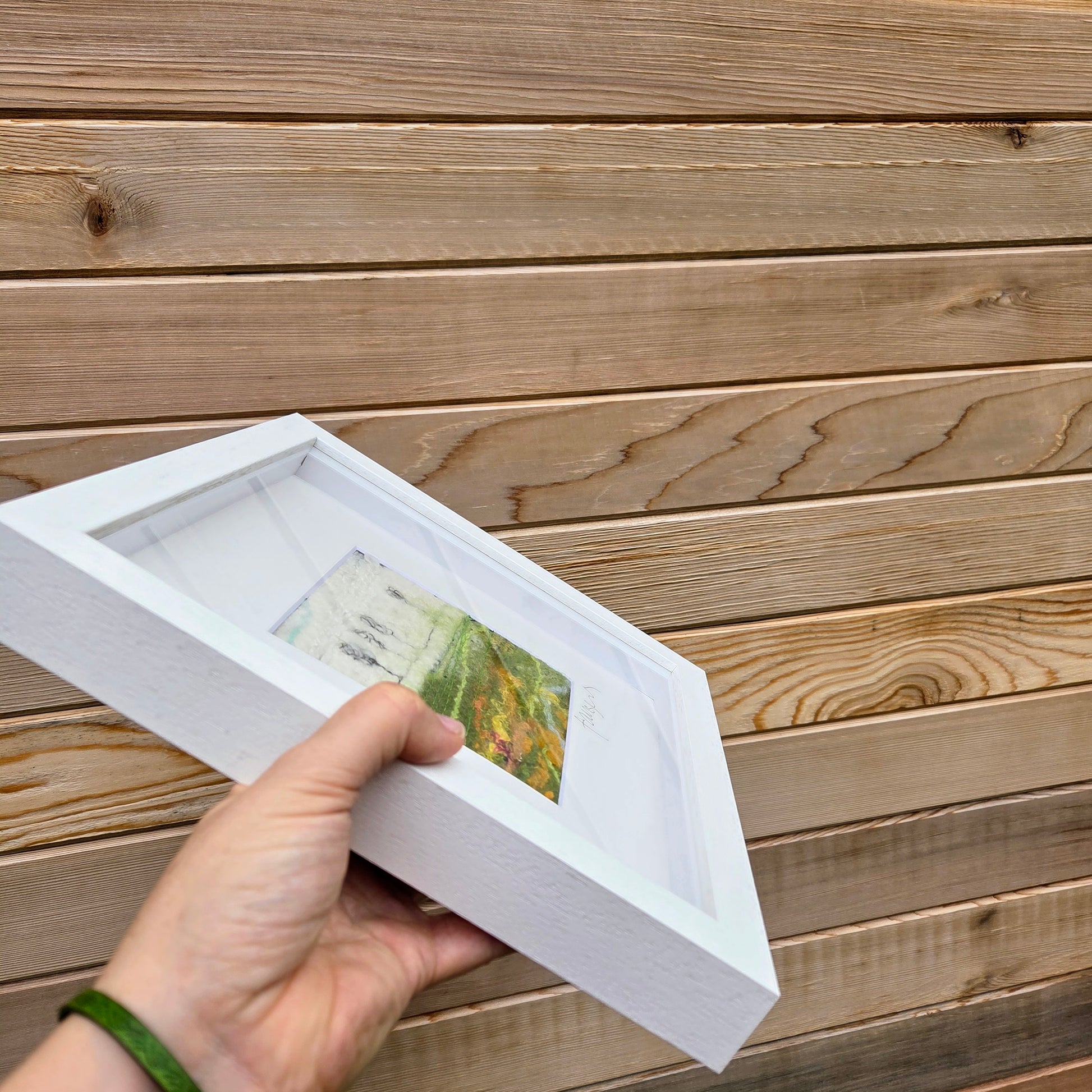 The inner landscape measures 12cm x 12cm, beautifully mounted and set within a white wood and glass Irish-made frame (26cm x 26cm) — ready to hang or gift.
