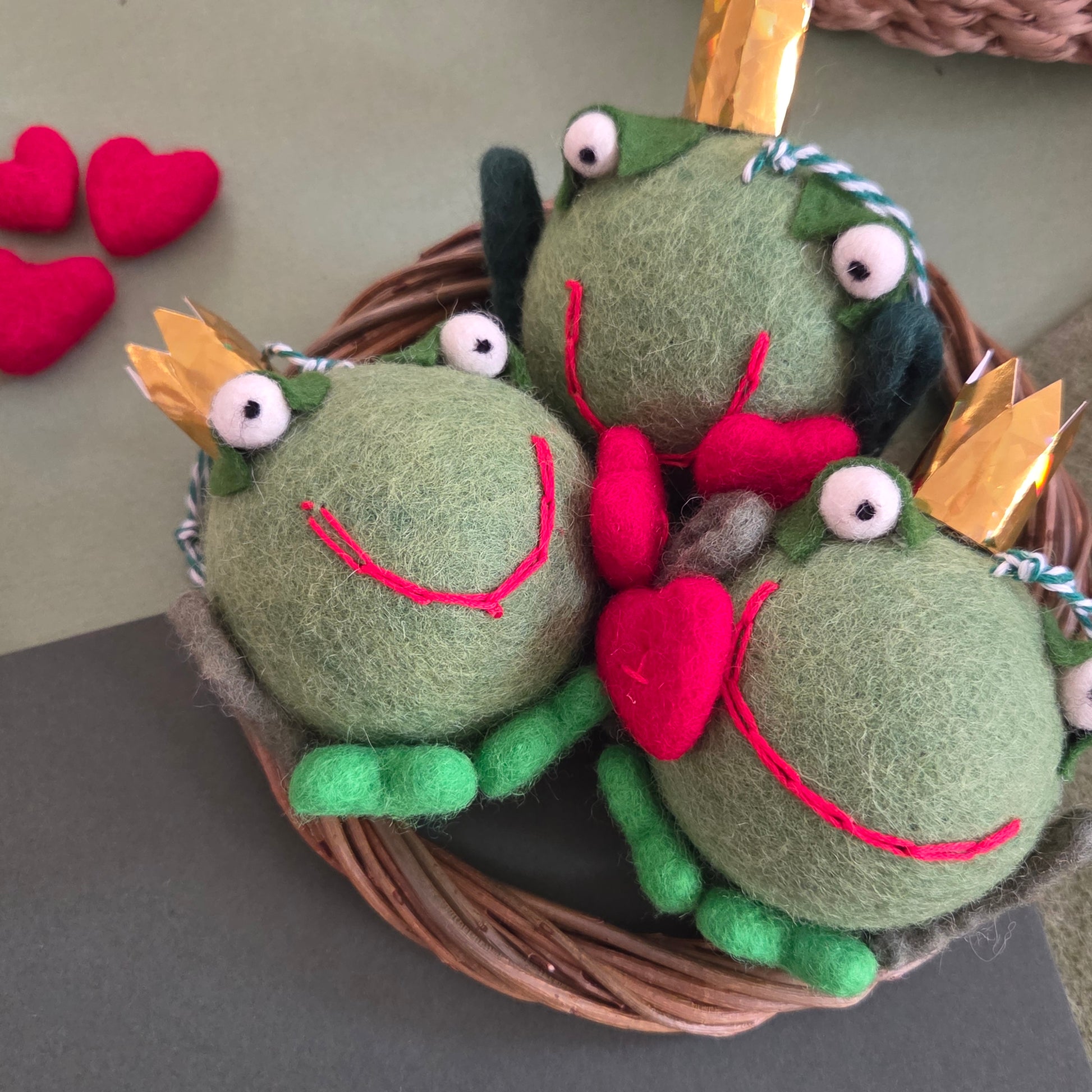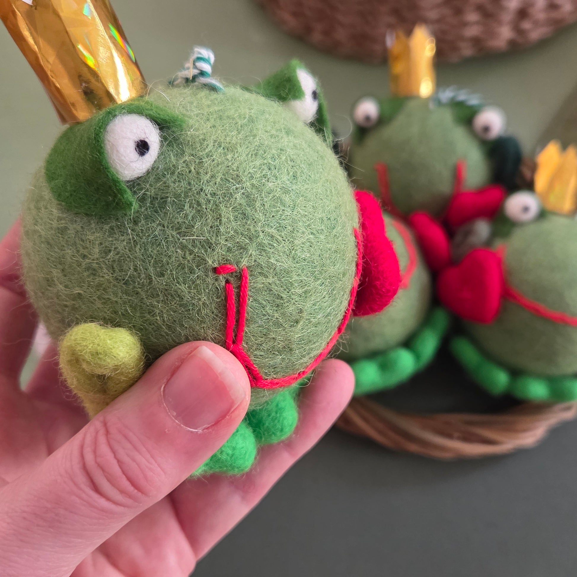 Meet the Frog Prince — a bright green, cheeky little character with a heart of gold (literally). This 8cm hand wet-felted bauble is lovingly made from 100% wool and brought to life with a red needle-felted heart, a sweet hand-embroidered smile, and a glossy golden crown fit for fairy-tale royalty.