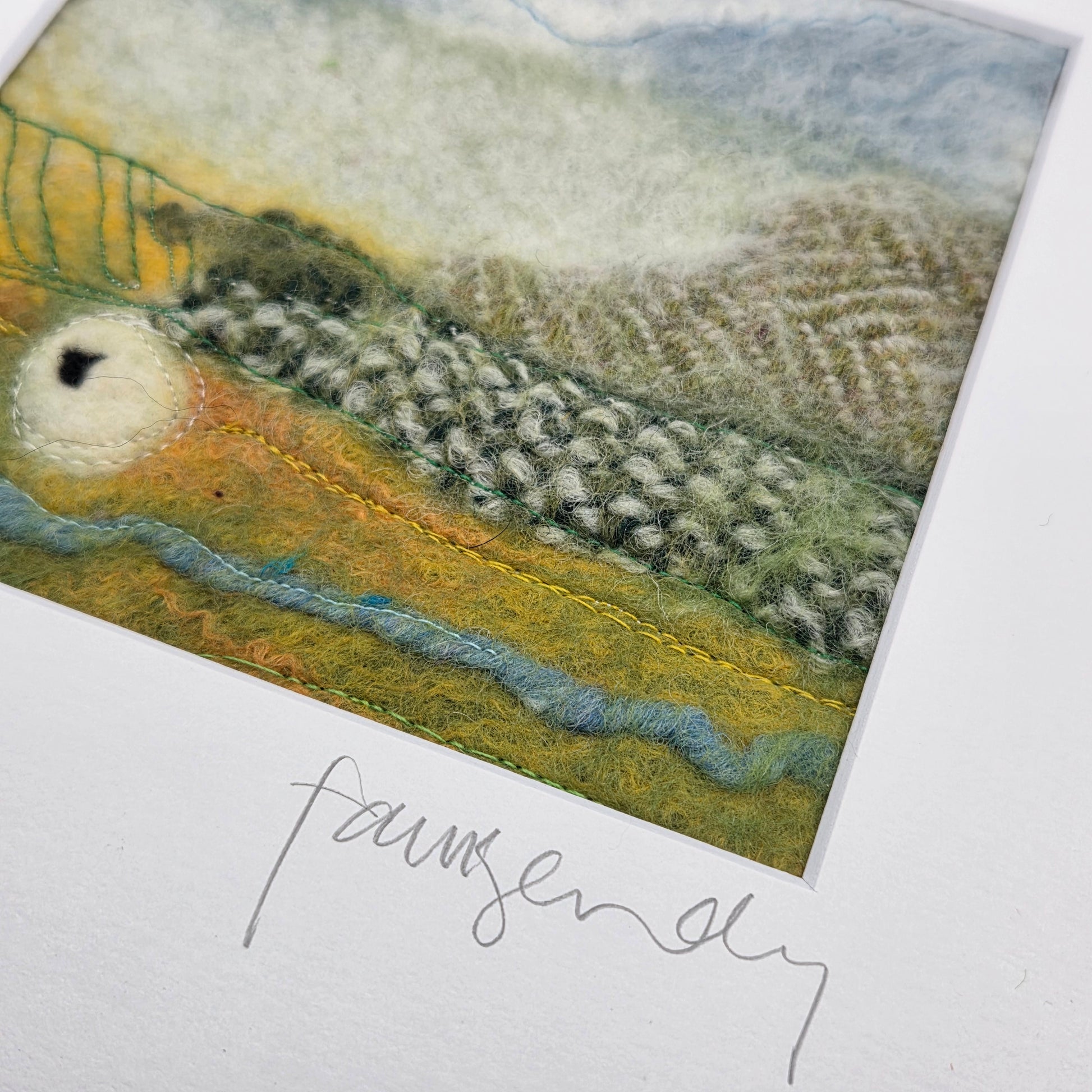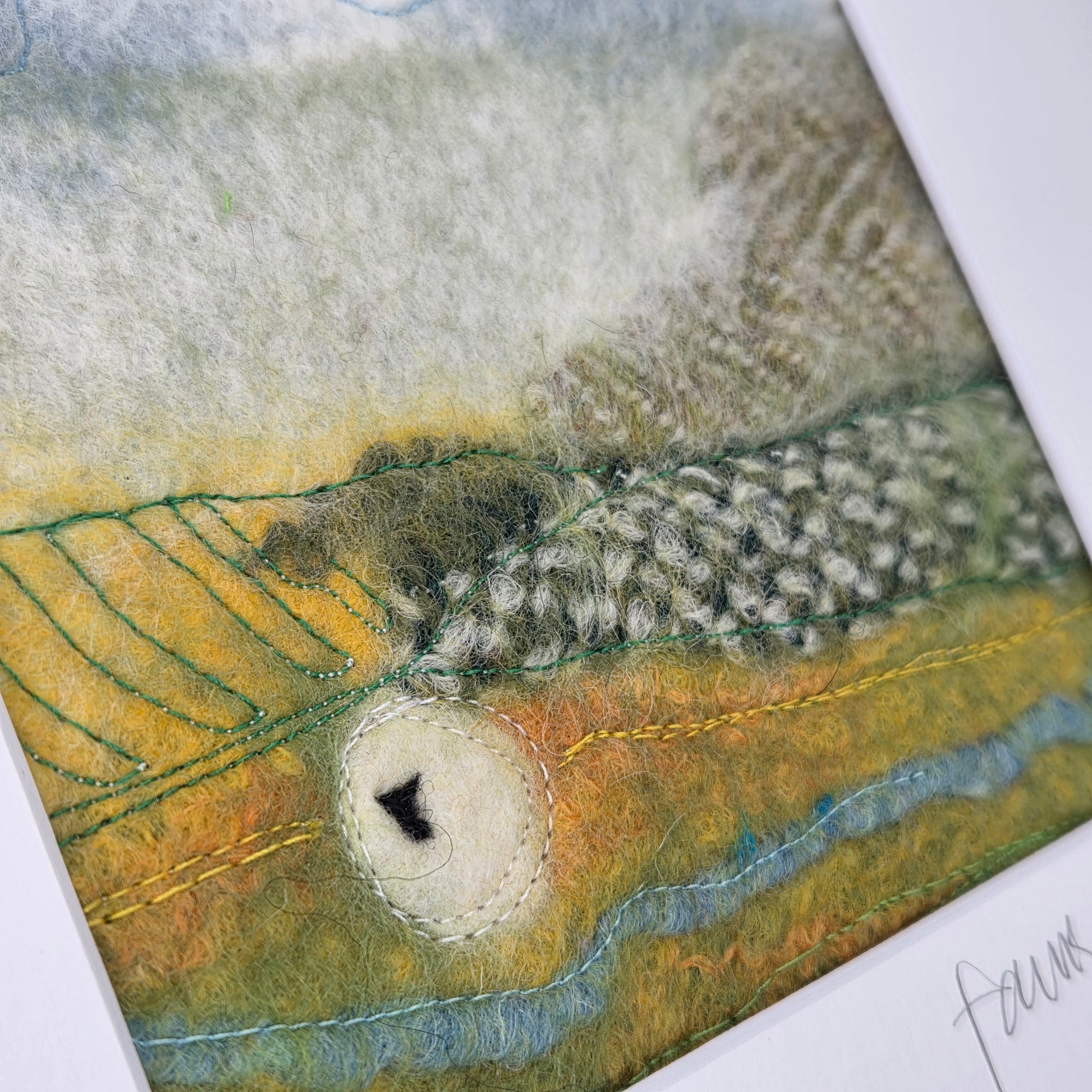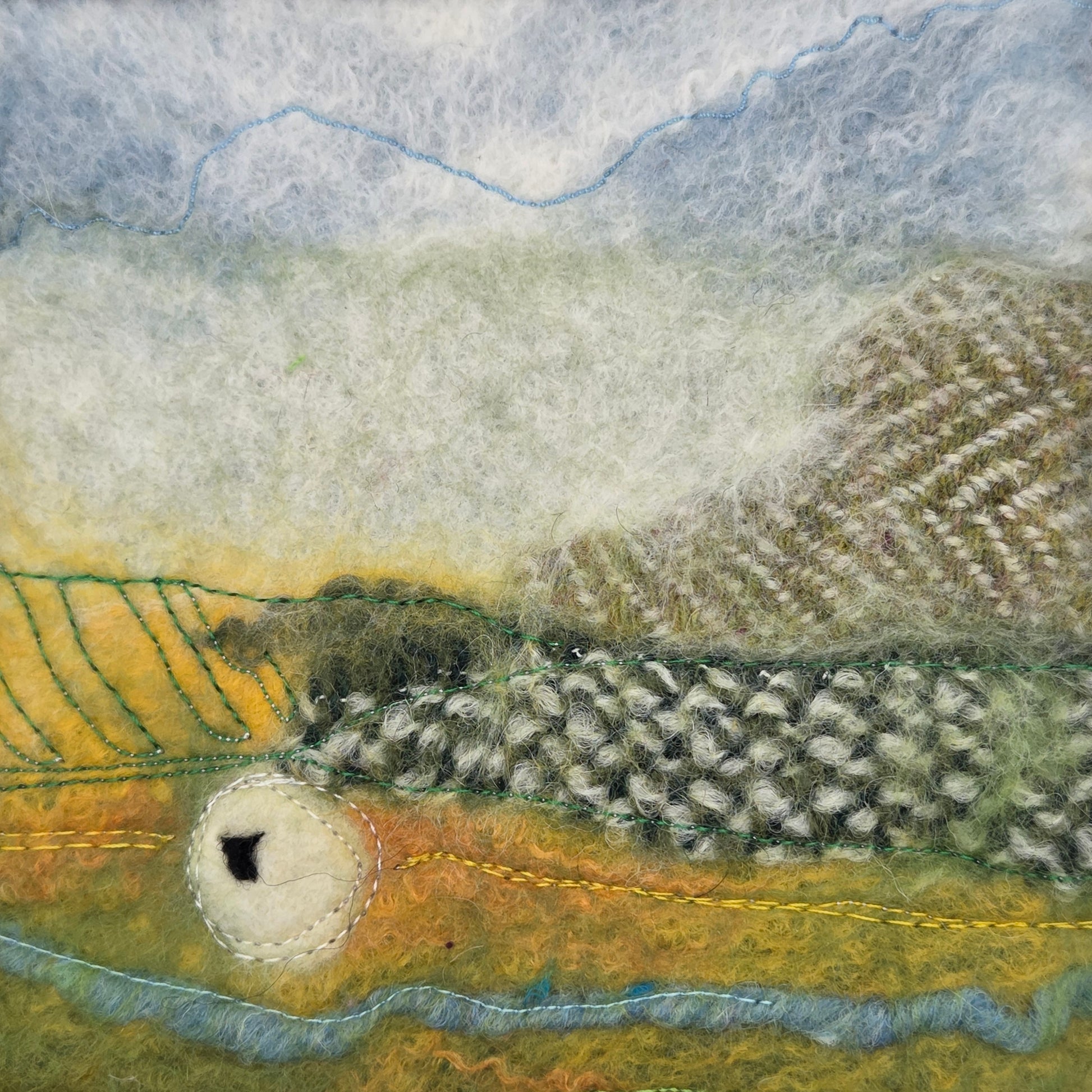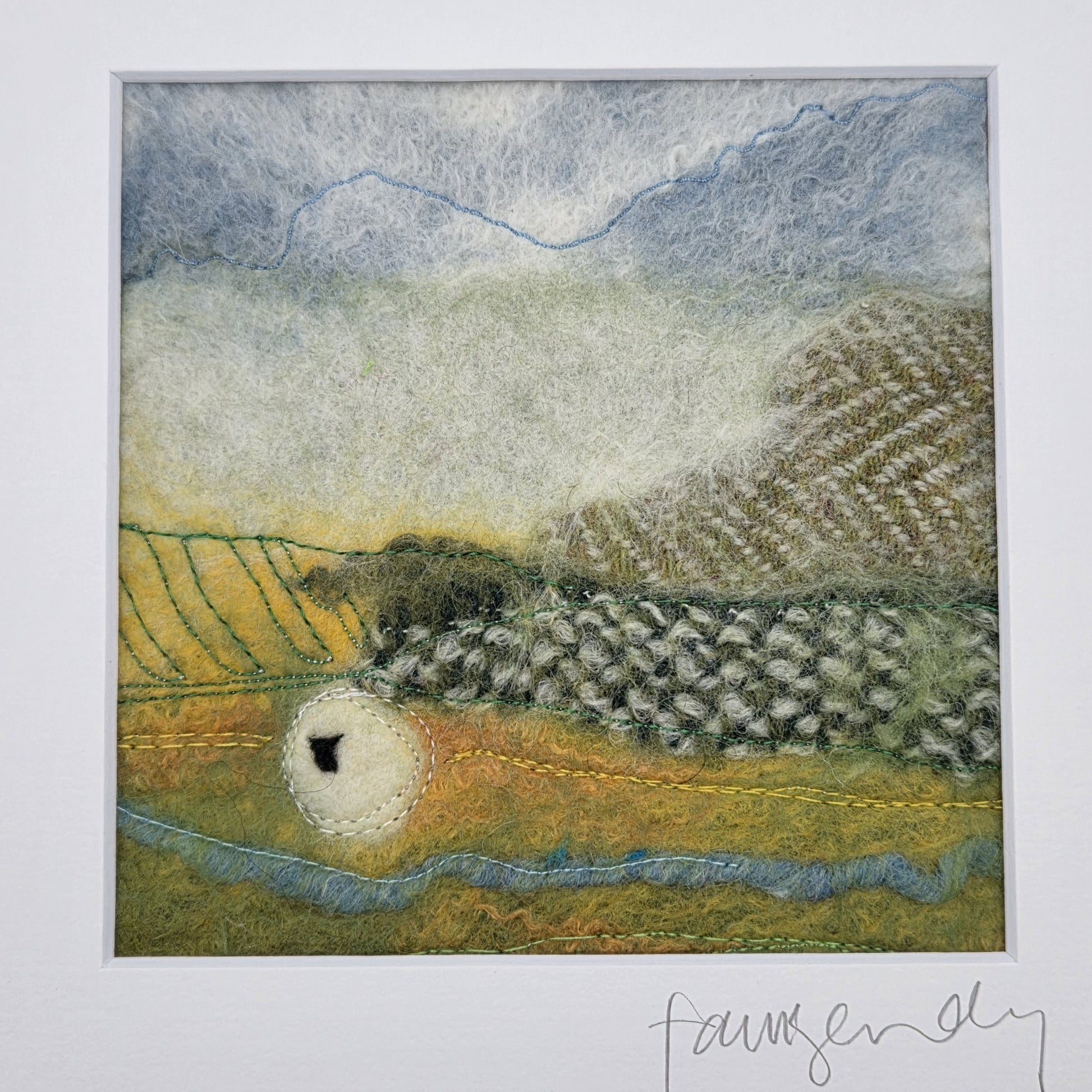 Inspired by the Irish horizon, each piece is created using wet felting and detailed with wool, cotton, silk, threads, and authentic Irish wool tweeds to capture the textures of the land. This piece showcases our famous sheep... The Curragh Sheep of Kildare where I live... and the famous flat horizon on a warm morning.