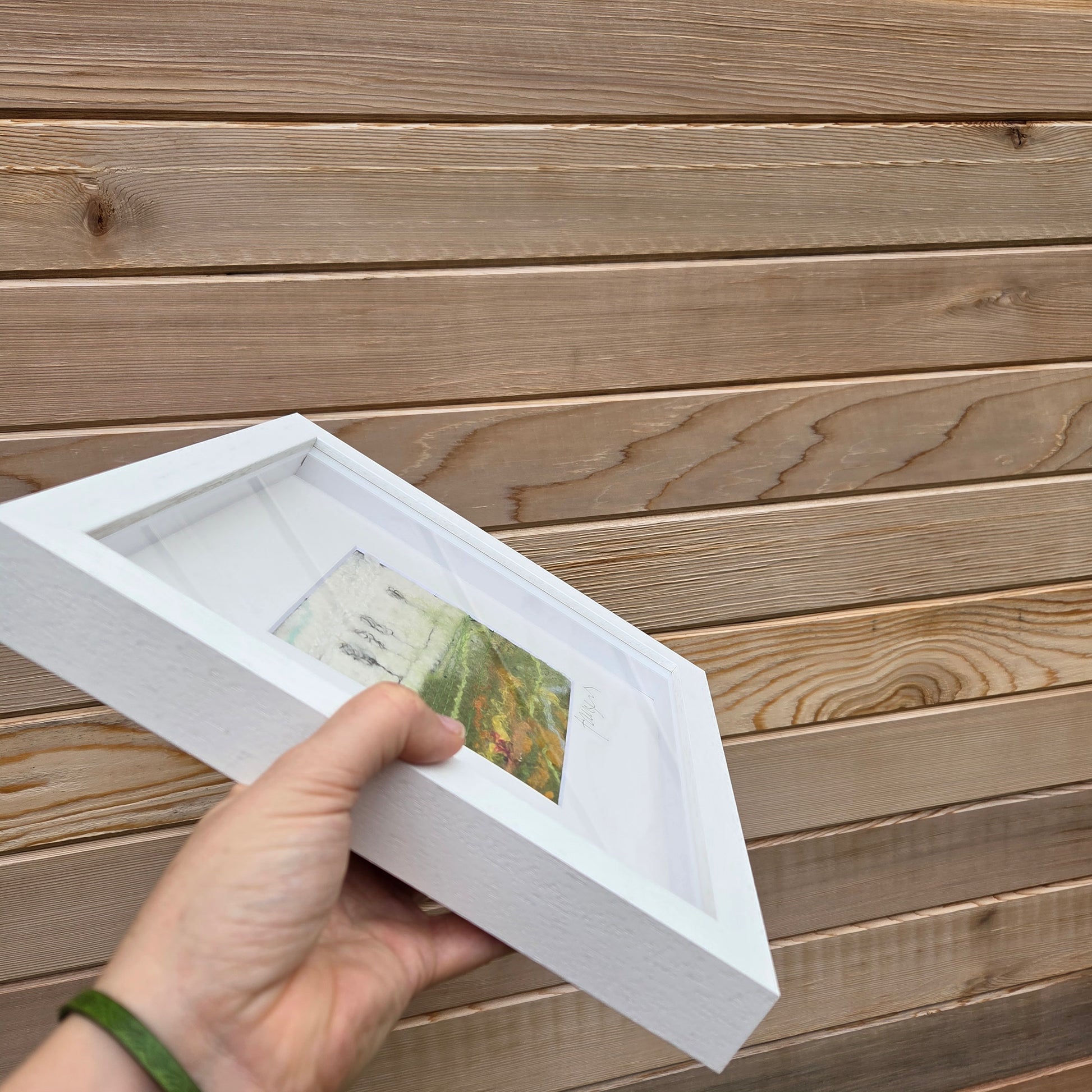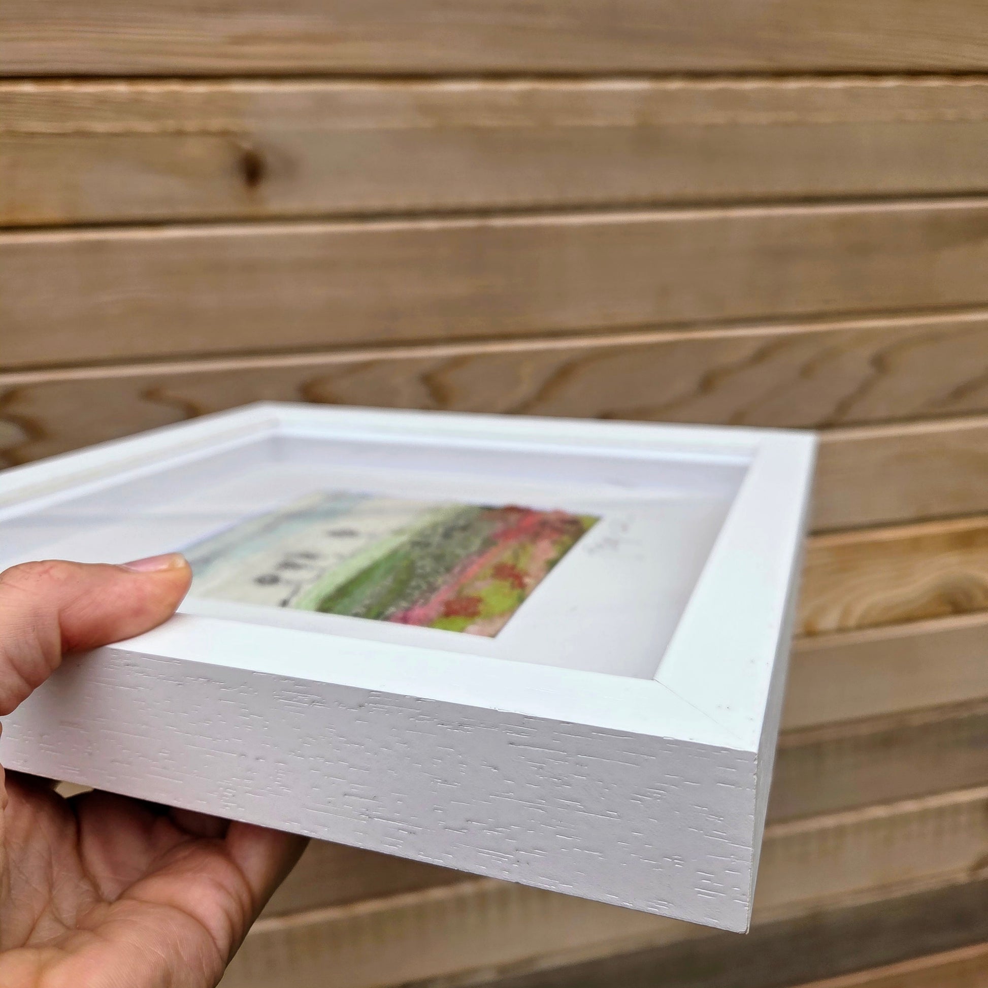 Framed in a white wood and glass Irish-made frame (26cm x 26cm) with a mounted 12cm x 12cm inner landscape — ready to hang or gift.