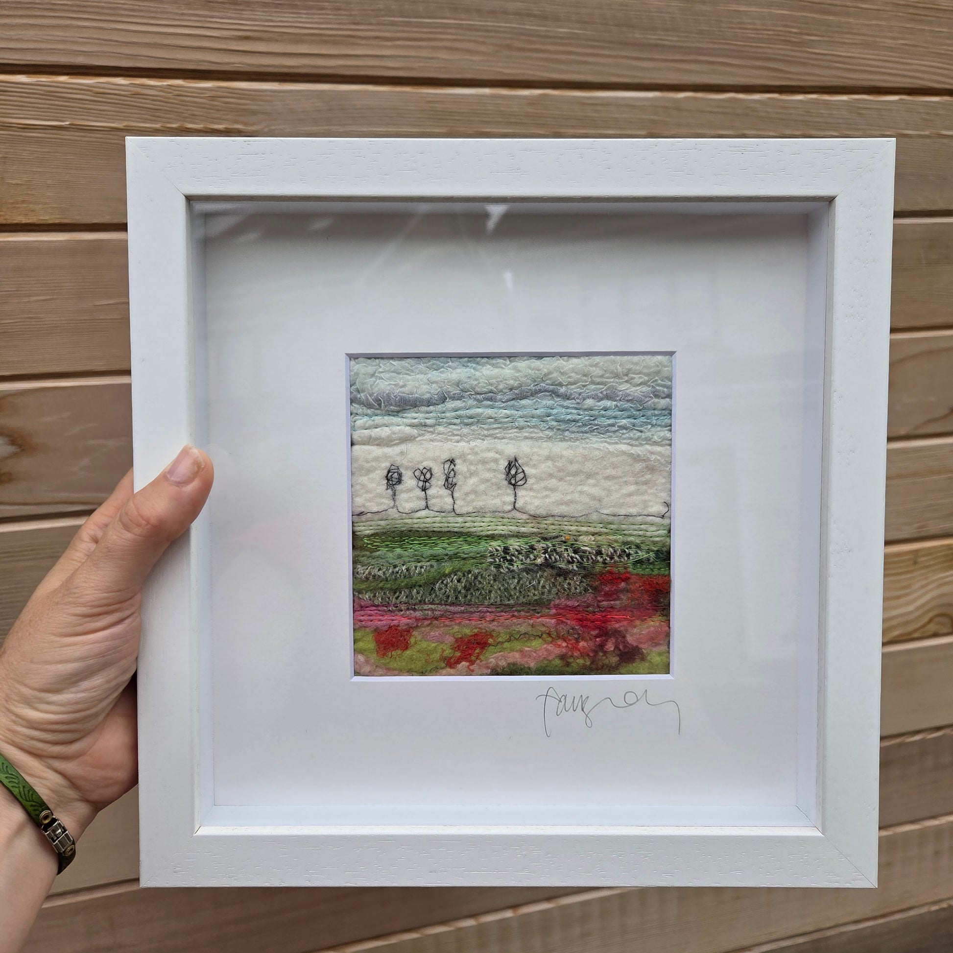 The inner landscape measures 12cm x 12cm, beautifully mounted and set within a white wood and glass Irish-made frame (26cm x 26cm) — ready to hang or gift.