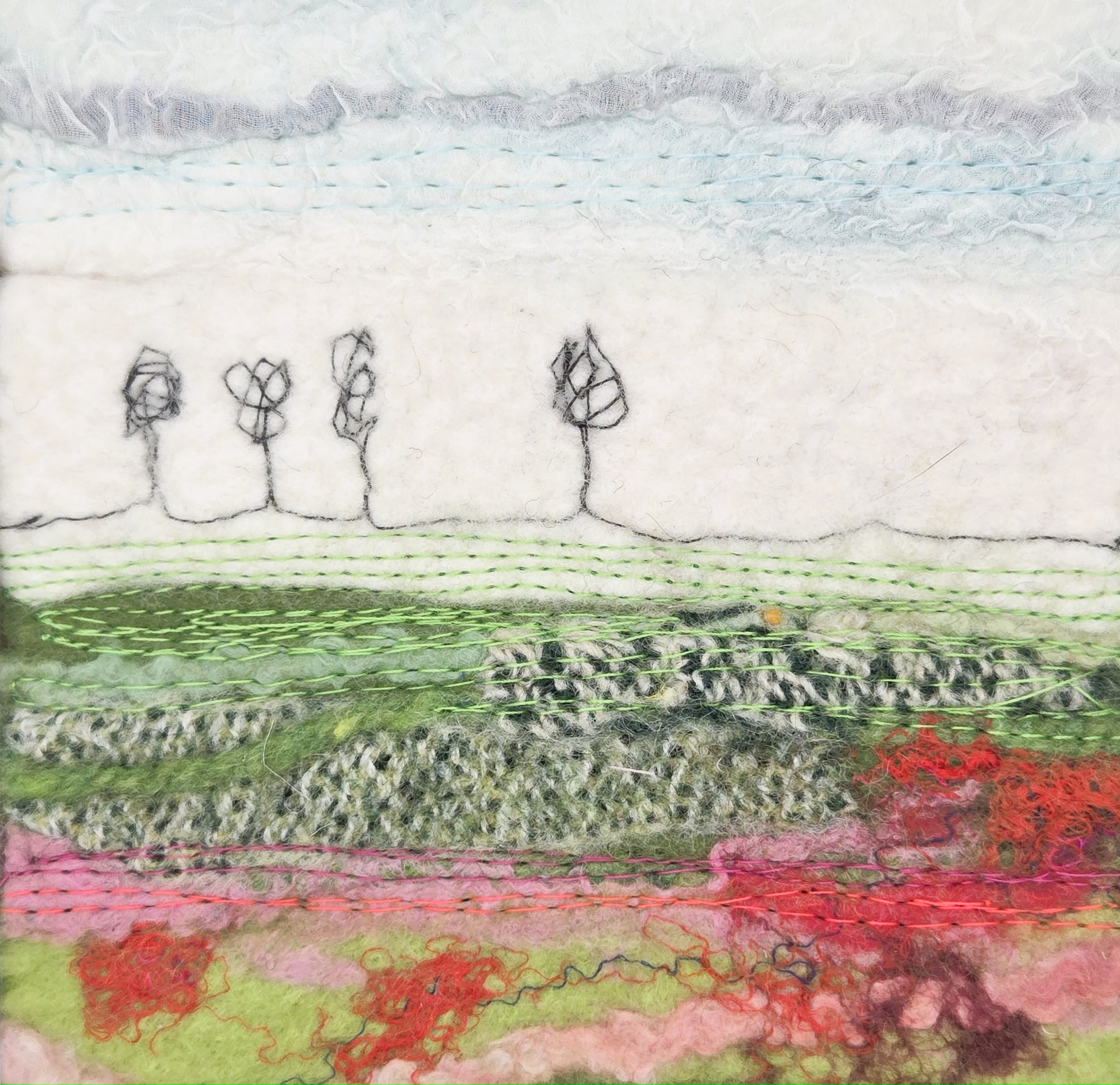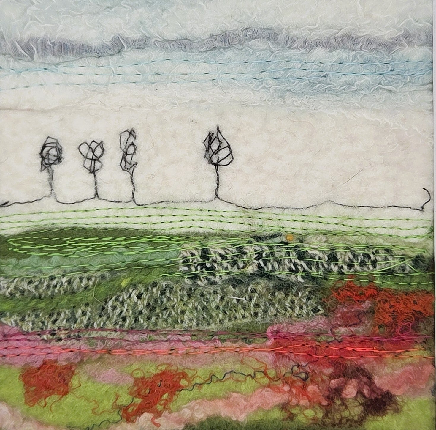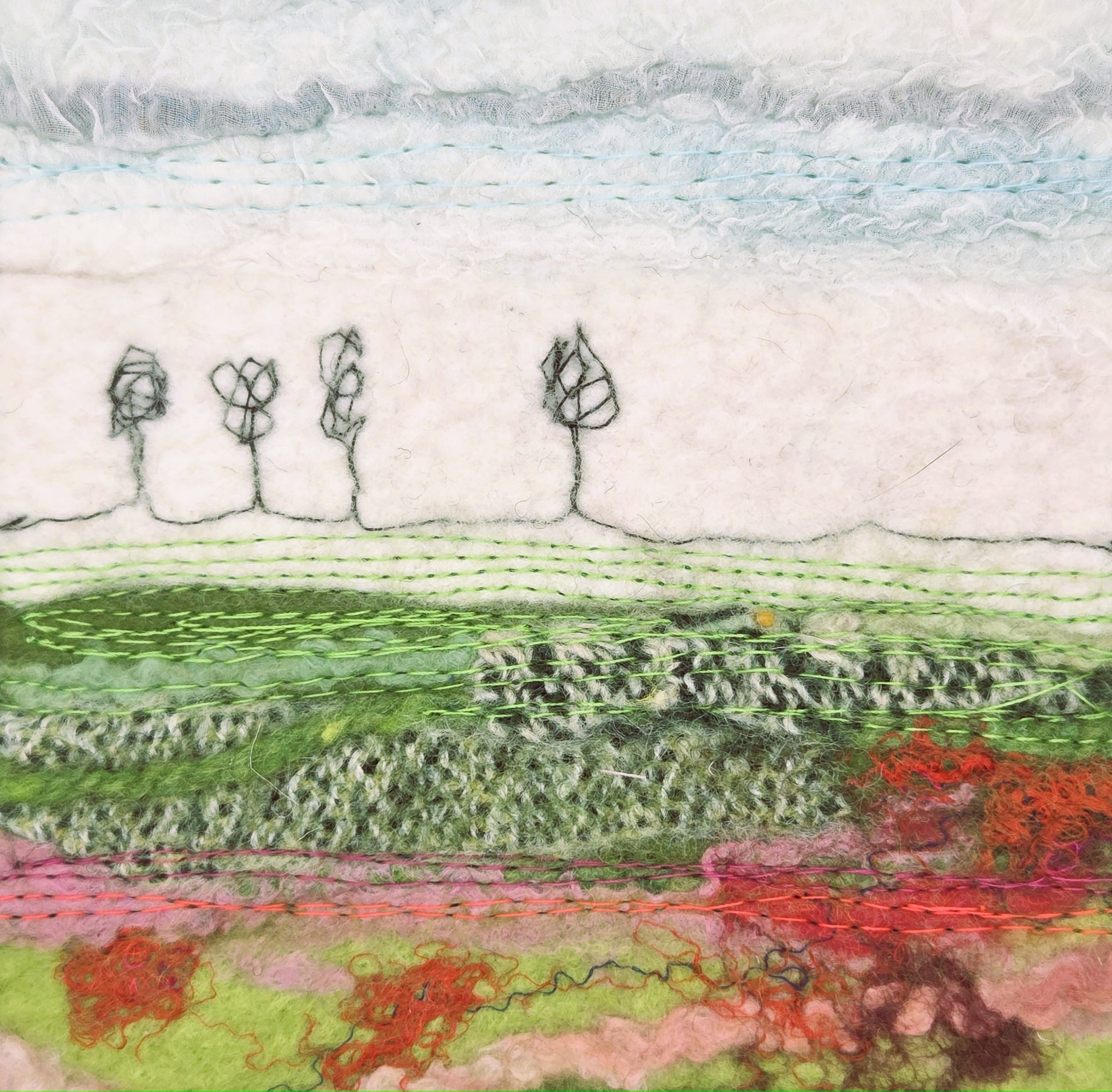 Inspired by the shifting horizon of County Kildare, these scenes are created using the wet felting technique, integrating natural wool, cotton, threads, silk, and Irish wool tweeds to echo the land’s rich textures and tones.