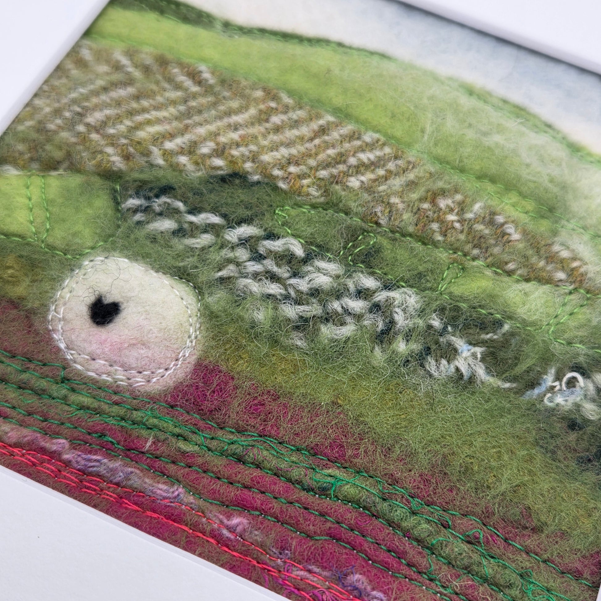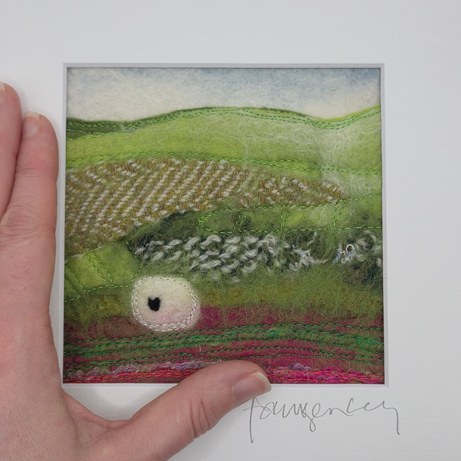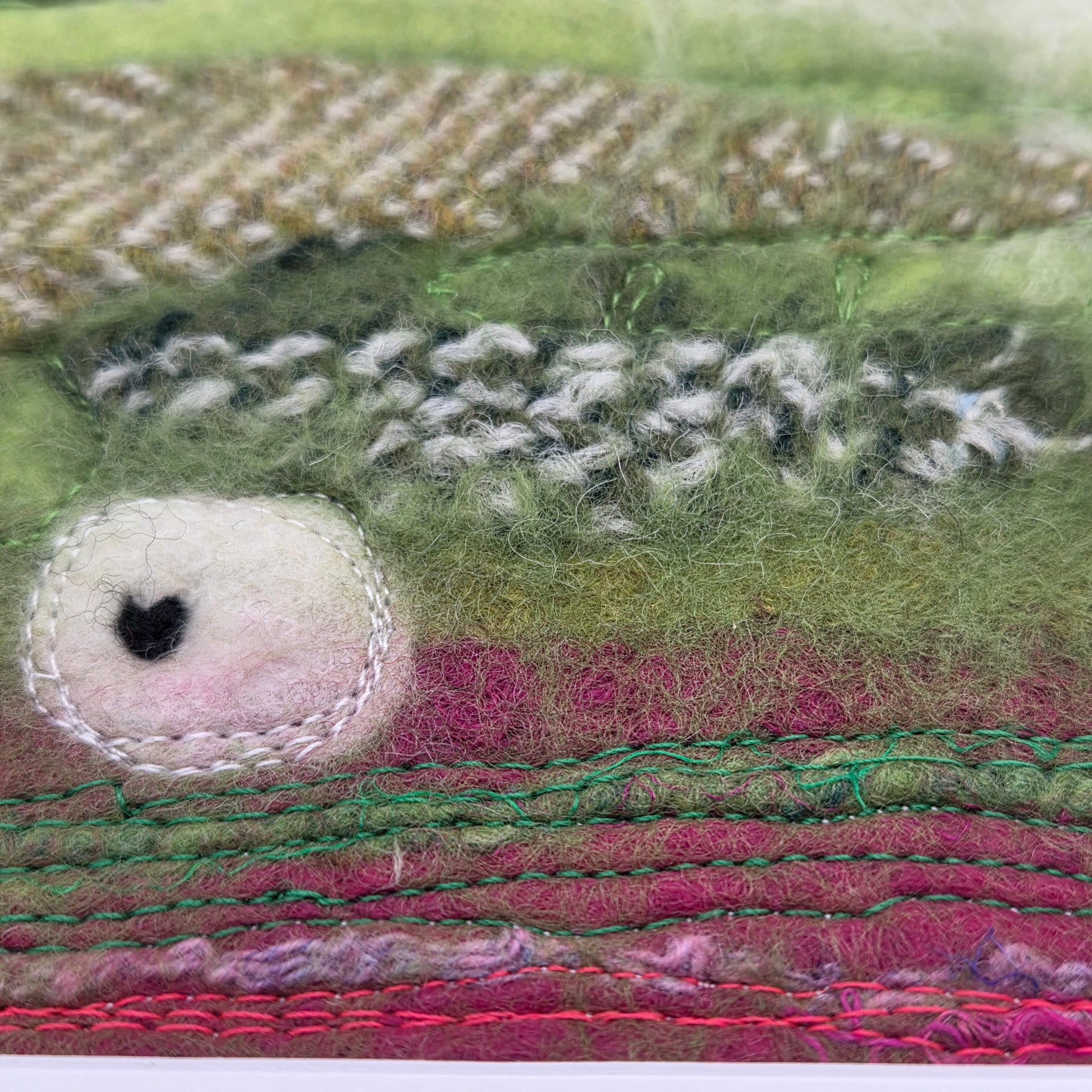 Inspired by the Irish horizon, each piece is created using wet felting and detailed with wool, cotton, silk, threads, and authentic Irish wool tweeds to capture the textures of the land. This piece showcases our ploughed fields and gently rolling hills... and of course our famous sheep.