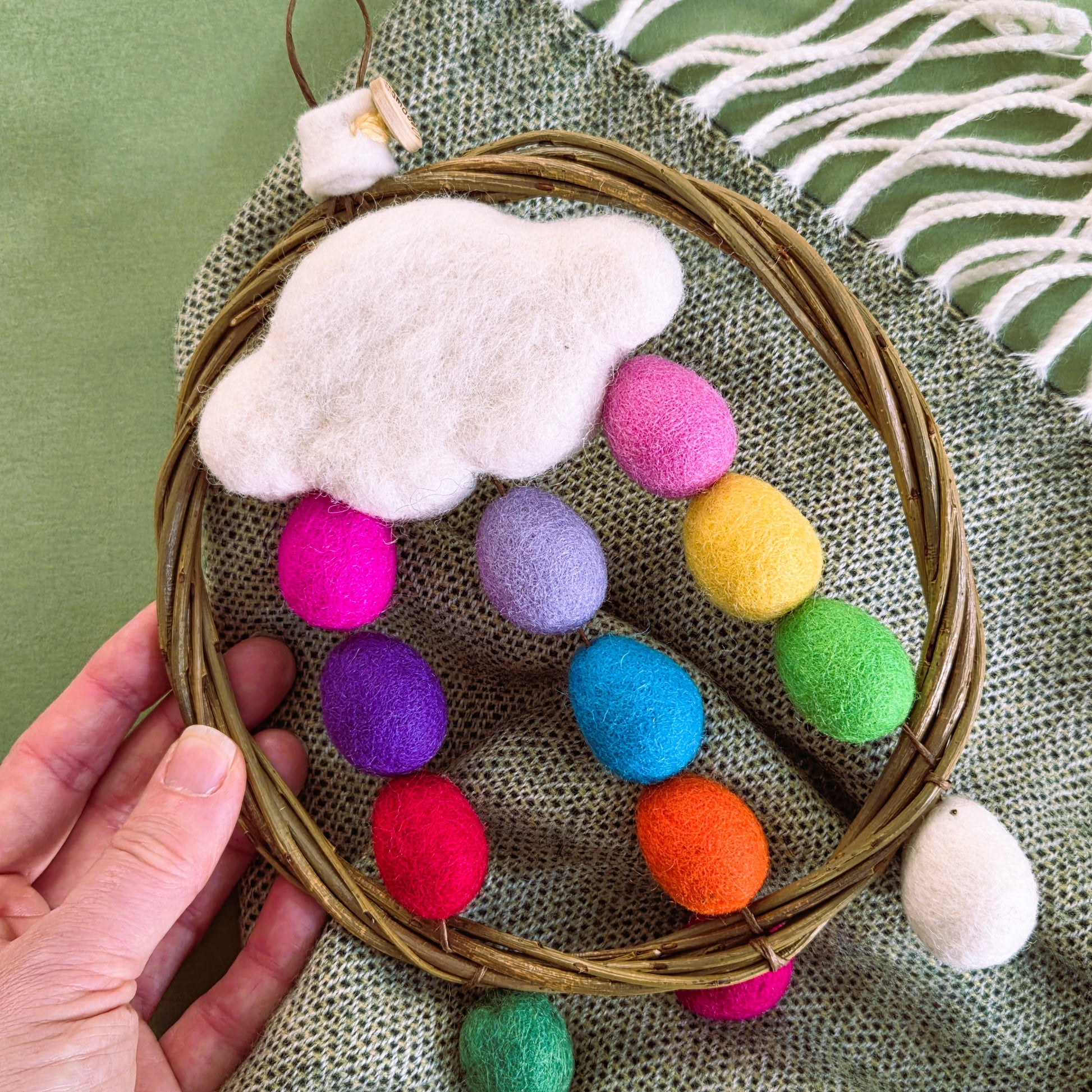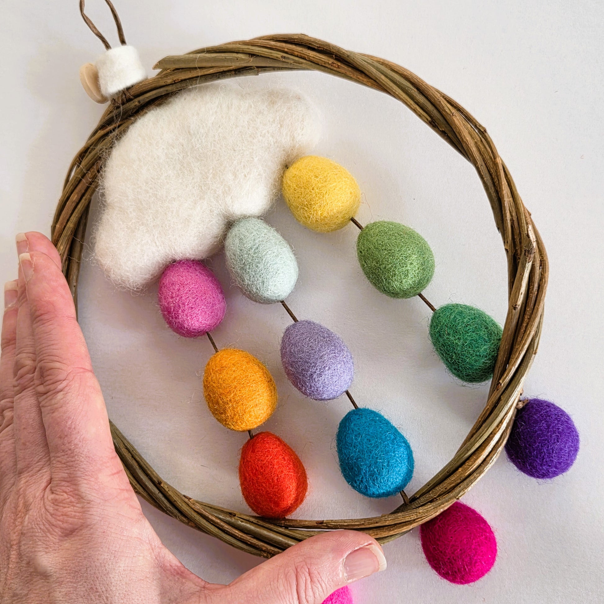 Bring a touch of magic to your space with this enchanting rainbow dreamcatcher wreath, lovingly handcrafted using locally sourced Irish willow and 100% pure wool. With vibrant rainbow tones (each wreath is one-of-a-kind and may vary slightly), it's a joyful, eye-catching piece perfect for brightening a nursery, playroom, or child’s bedroom.