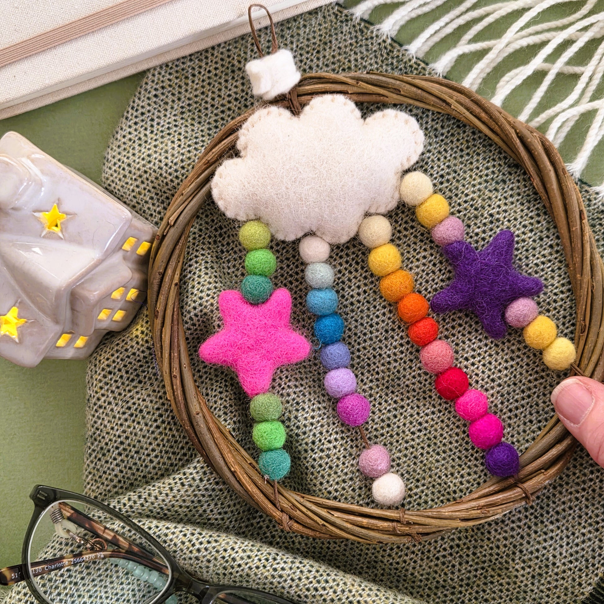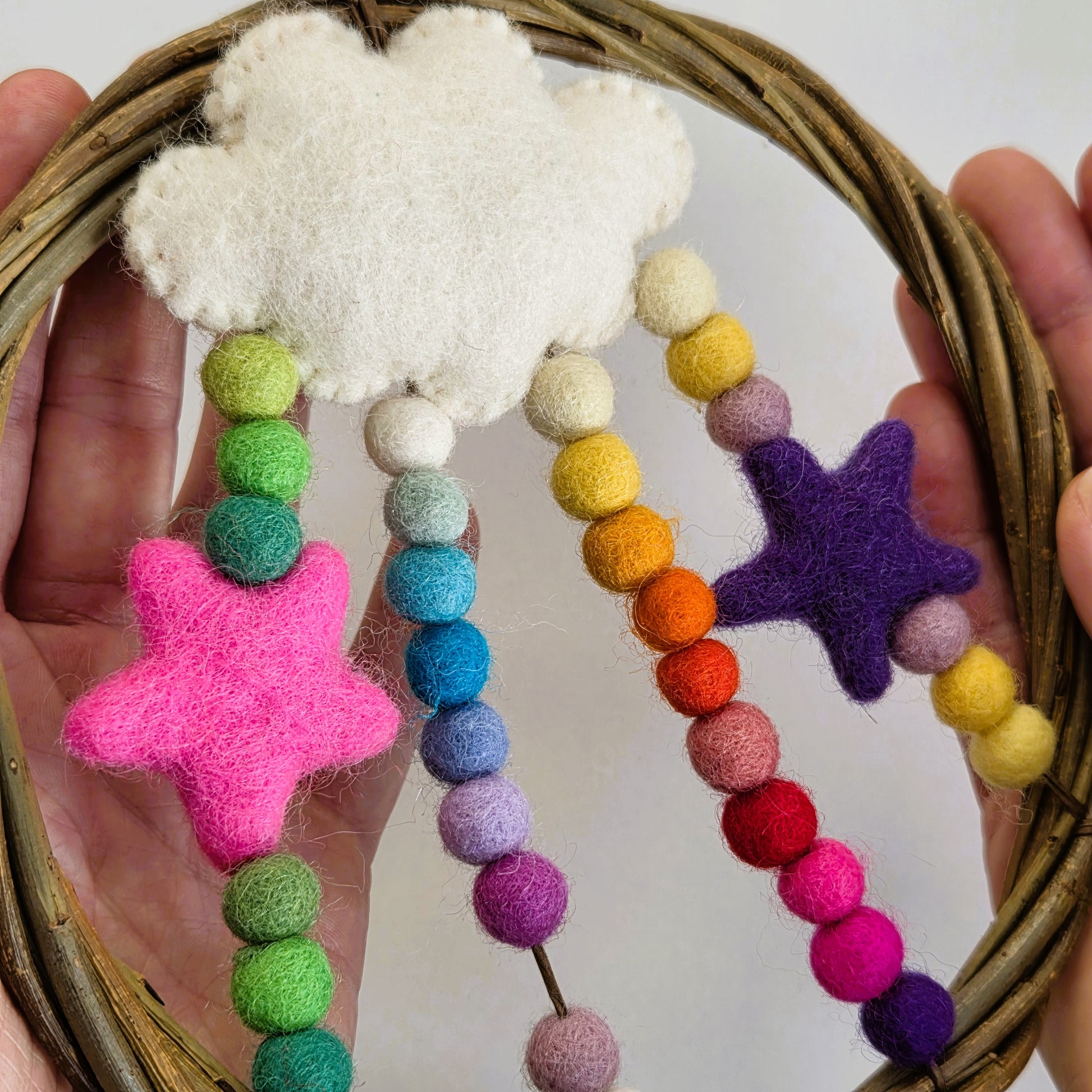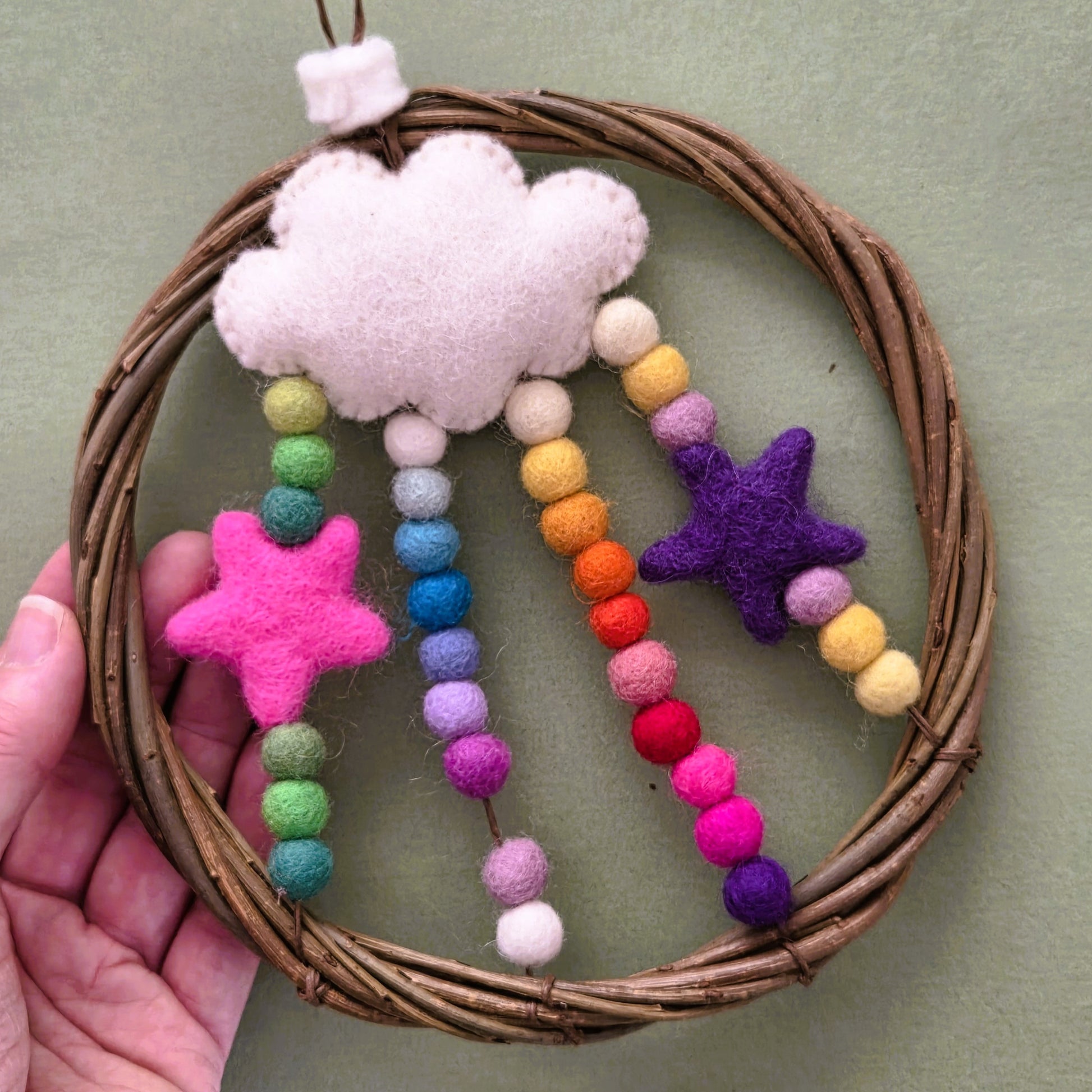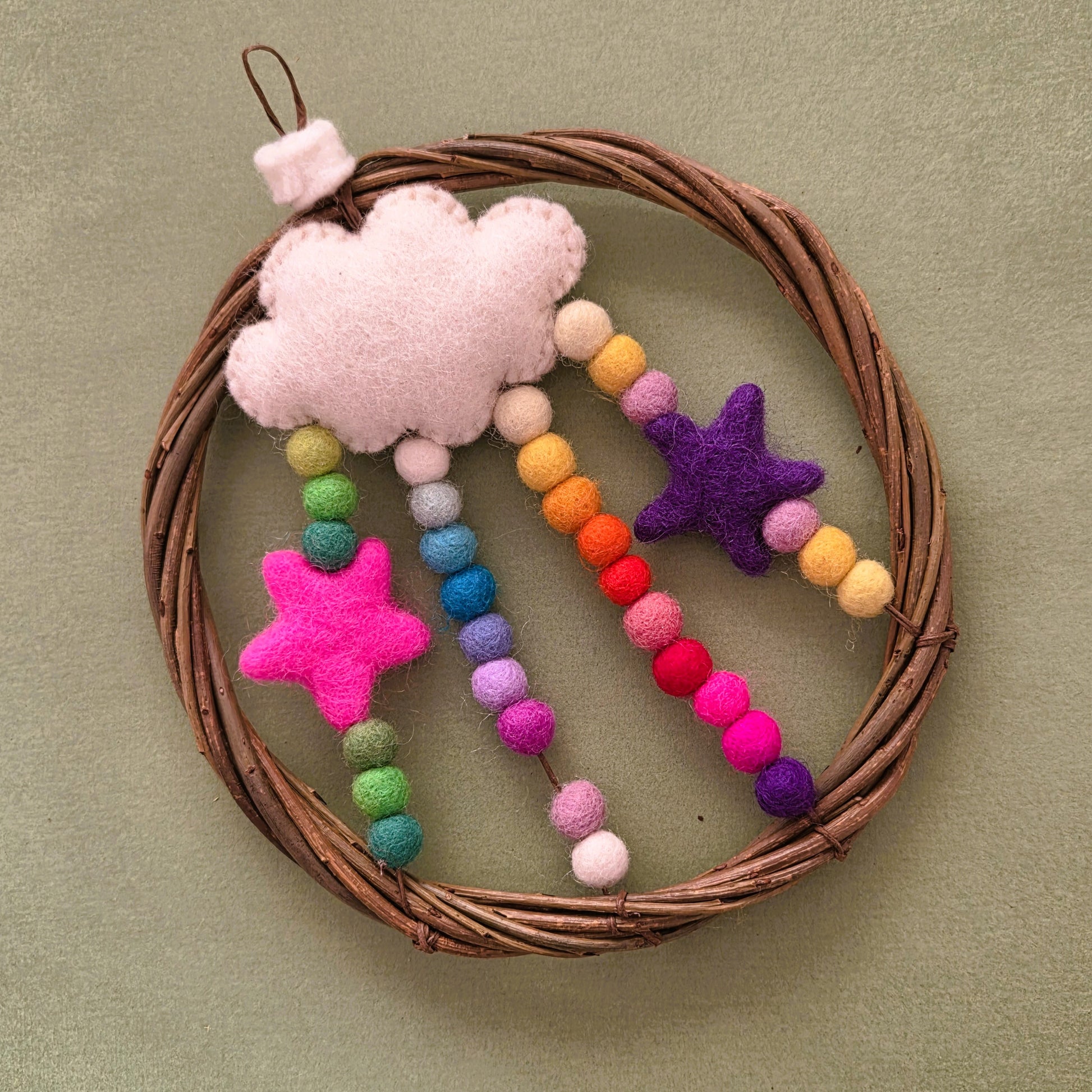 Handwoven from Irish-grown willow (16–18cm), this joyful dreamcatcher bursts with colour and character. Adorned with soft, 100% wool mini pom poms and two whimsical stars, it’s designed to spark imagination, inspire adventure, and encourage big dreams.