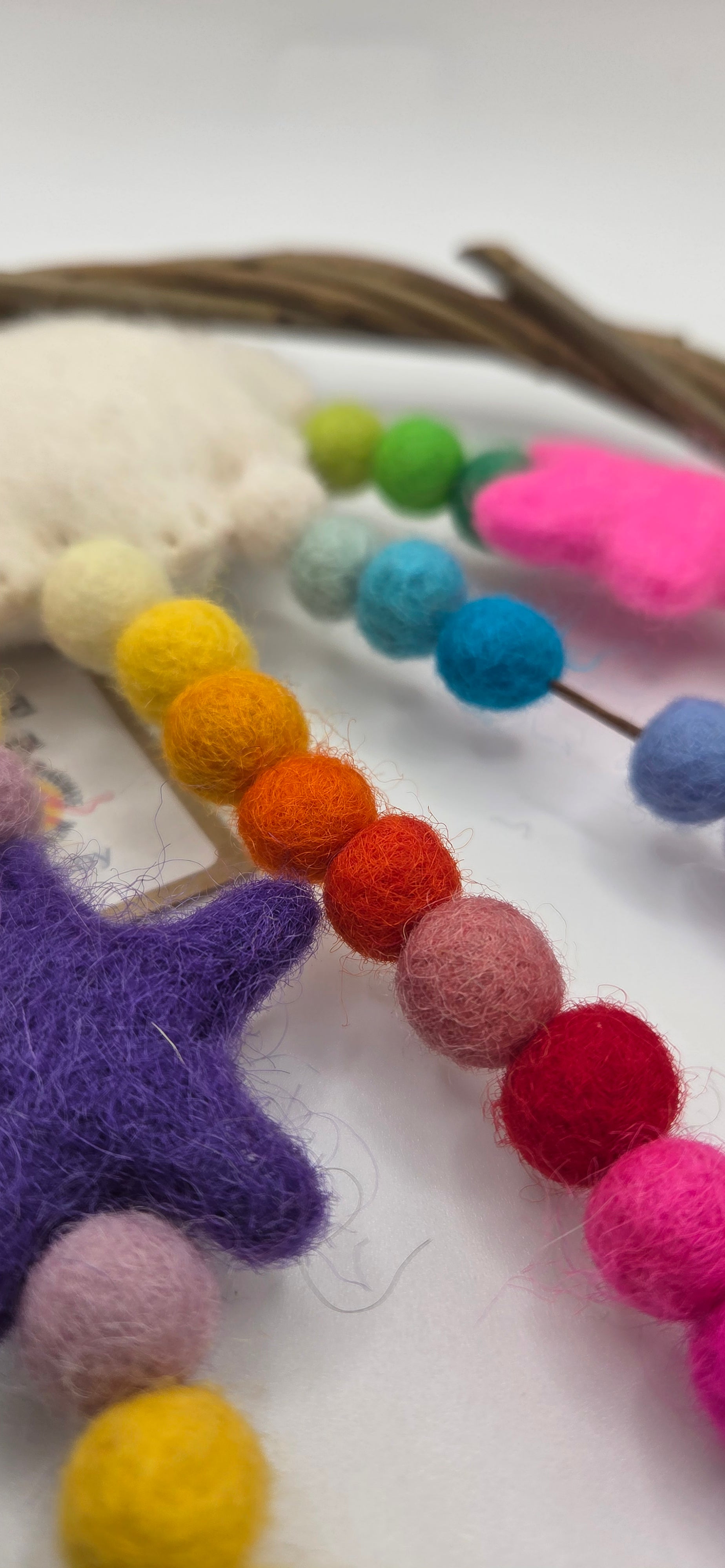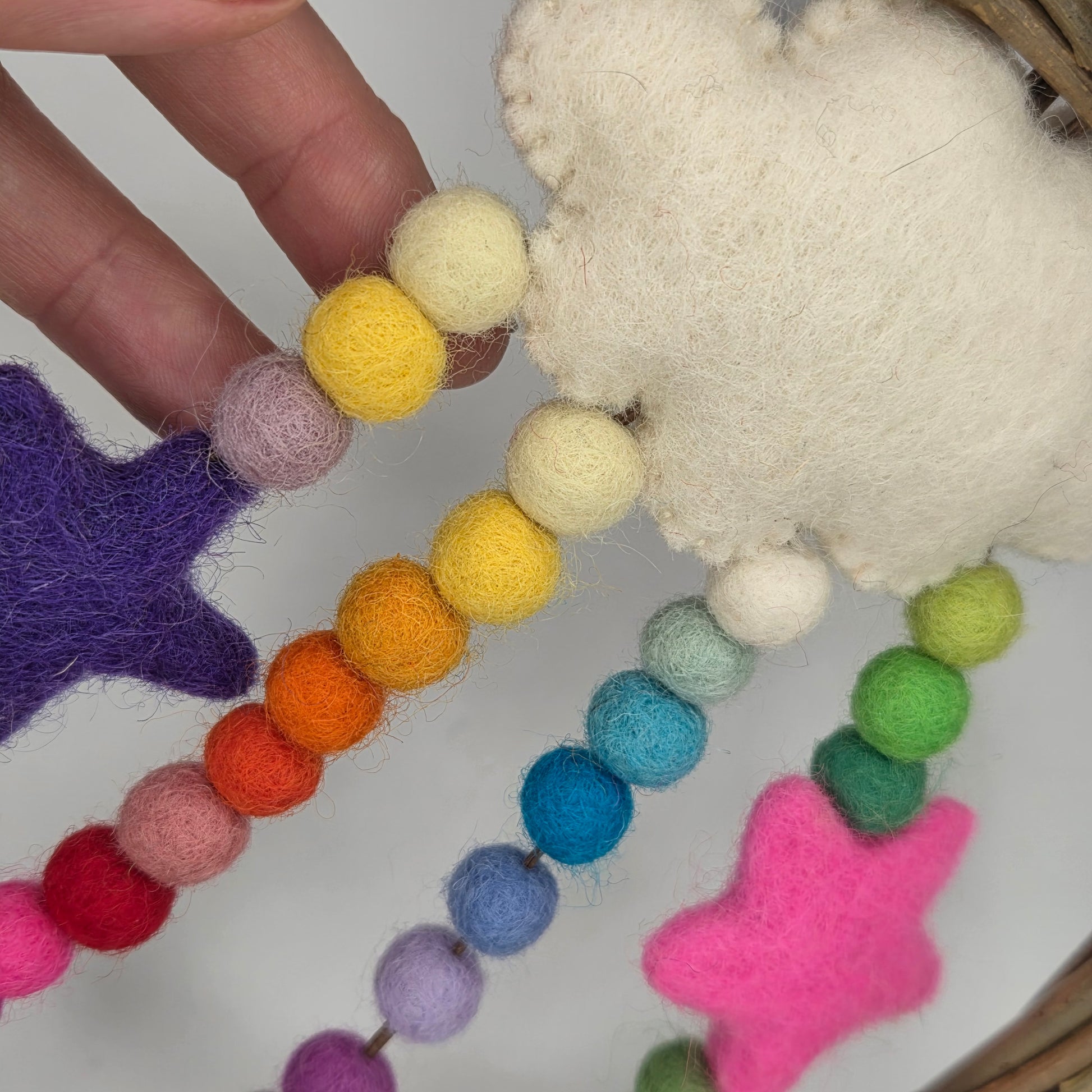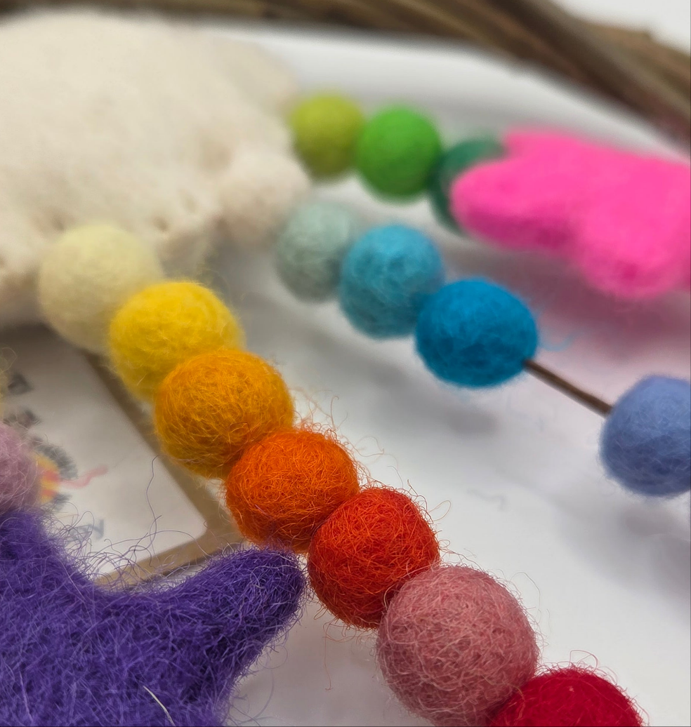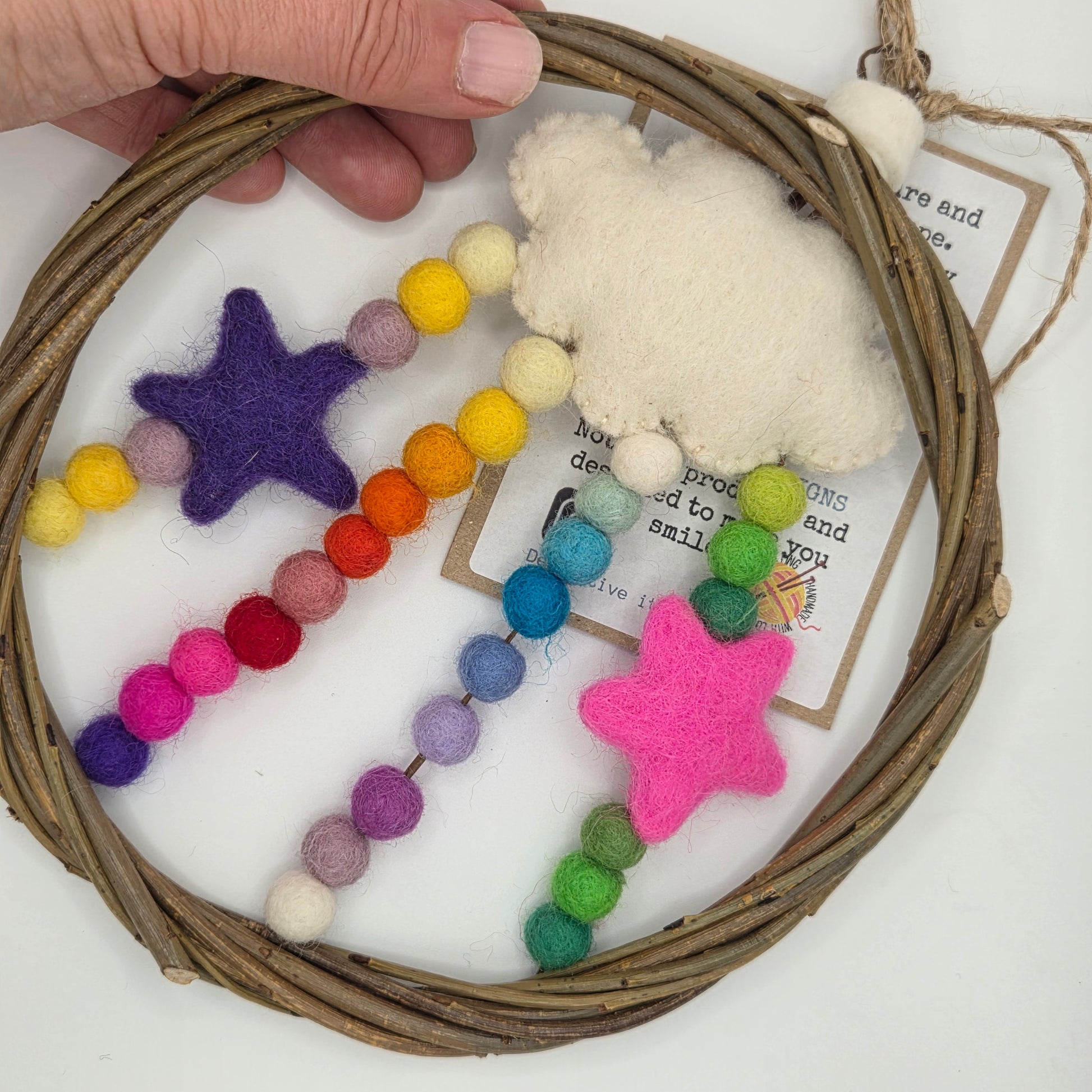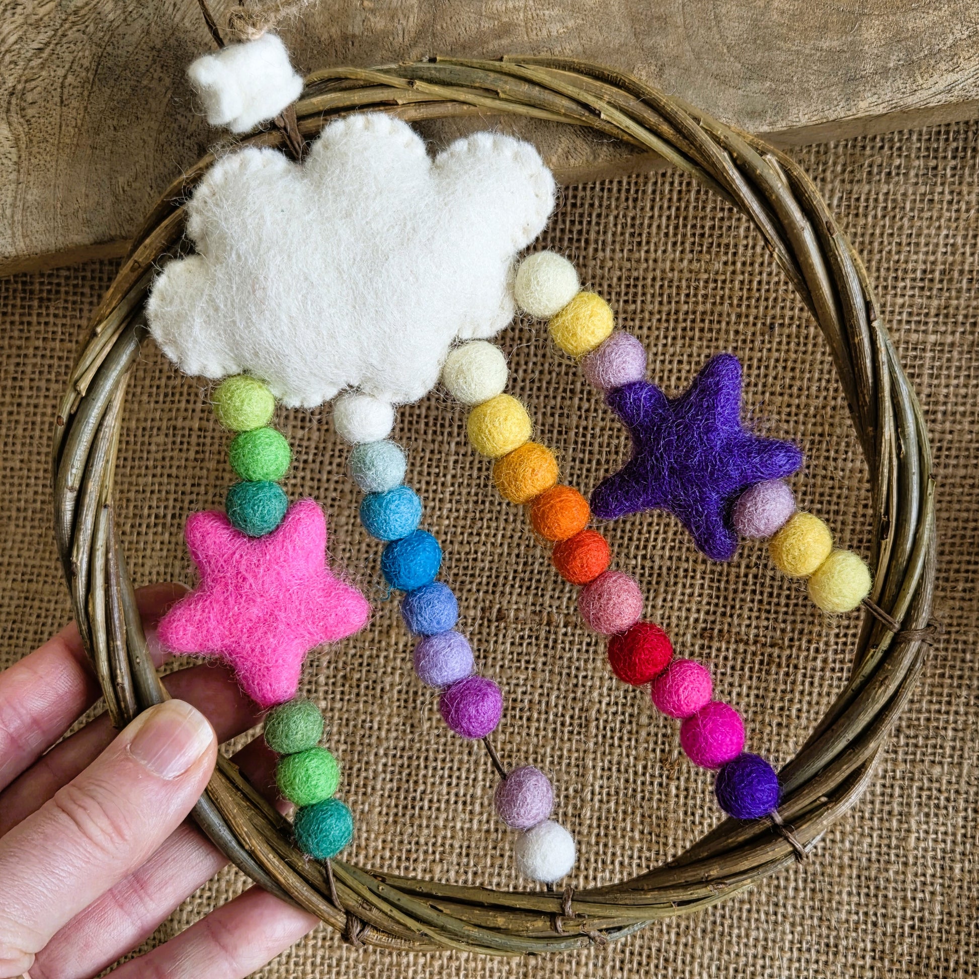 Handwoven from Irish-grown willow (16–18cm), this joyful dreamcatcher bursts with colour and character. Adorned with soft, 100% wool mini pom poms and two whimsical stars, it’s designed to spark imagination, inspire adventure, and encourage big dreams.