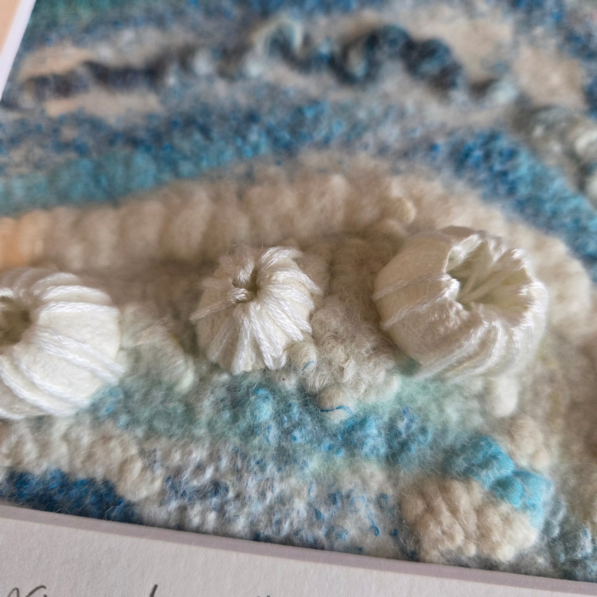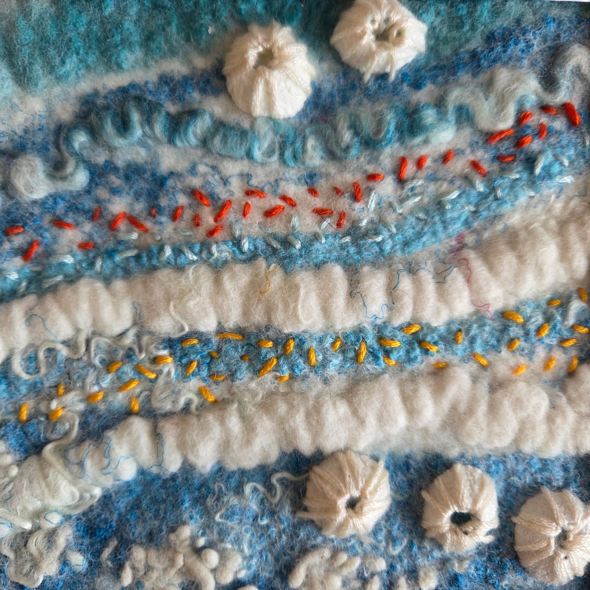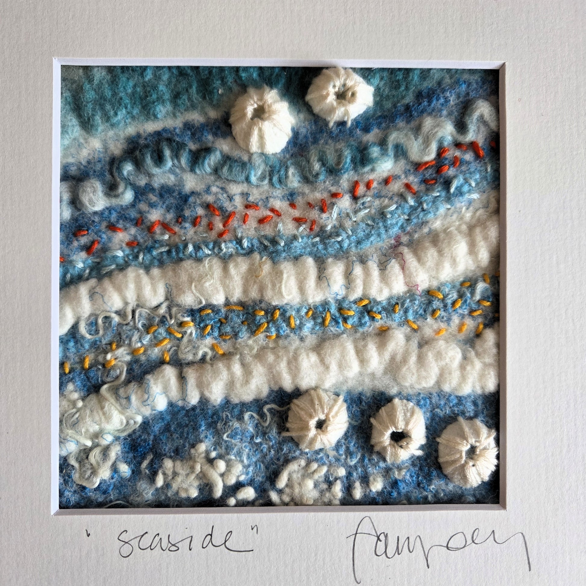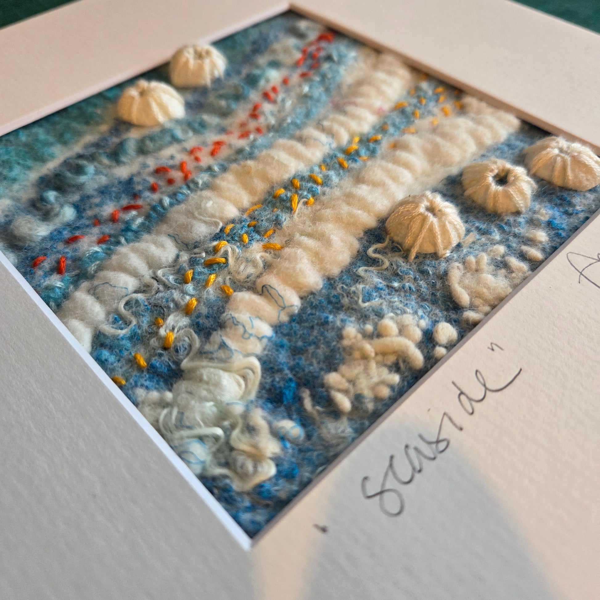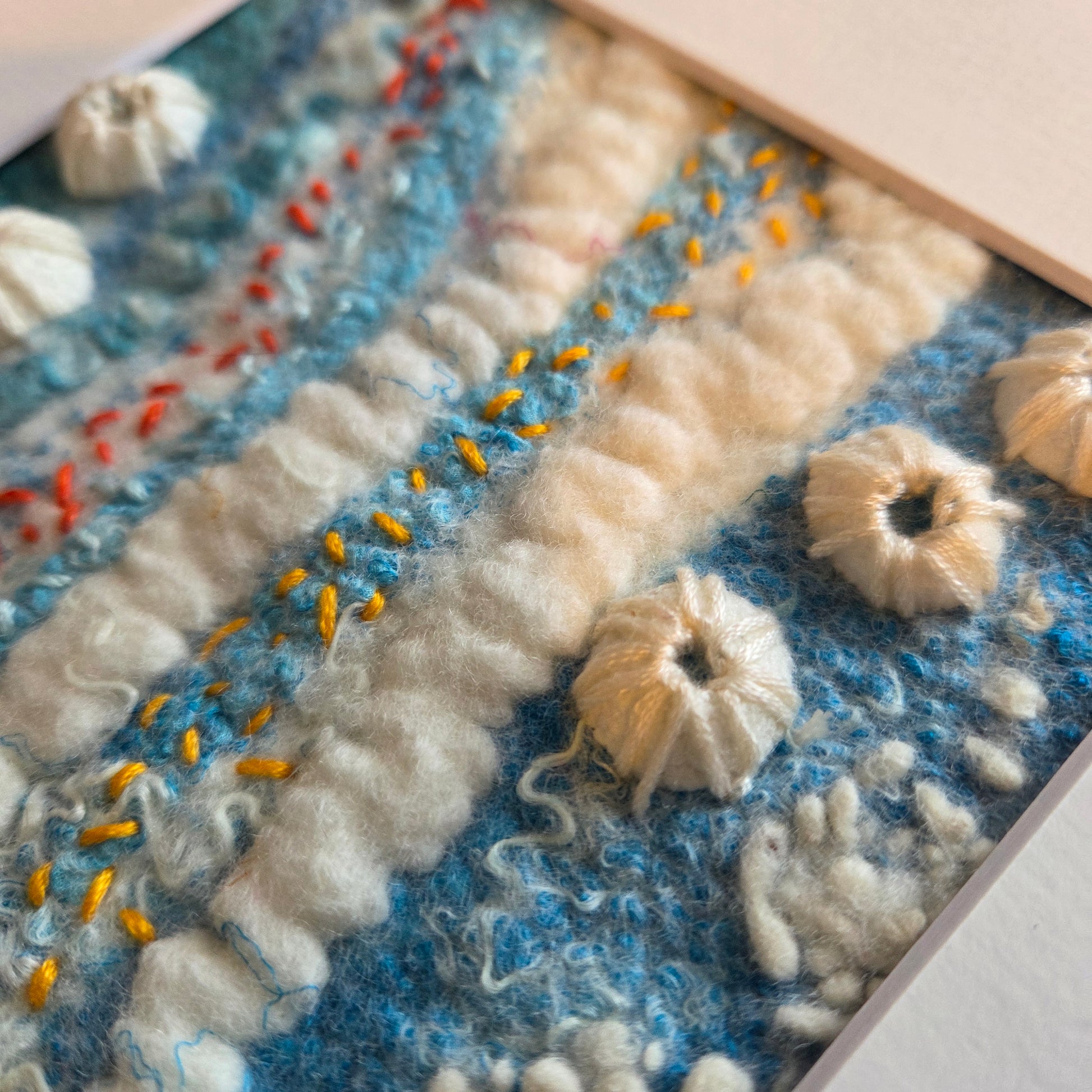 Inspired by the irish coastline and my years spent "rockpooling" in Co.Donegal. These scenes are created using the wet felting technique, integrating natural wool, cotton, threads, silk, and silk cocoons, textural embroidery techniques that give a 3 dimensional impression to echo the seaside and the waters rich textures and tones.