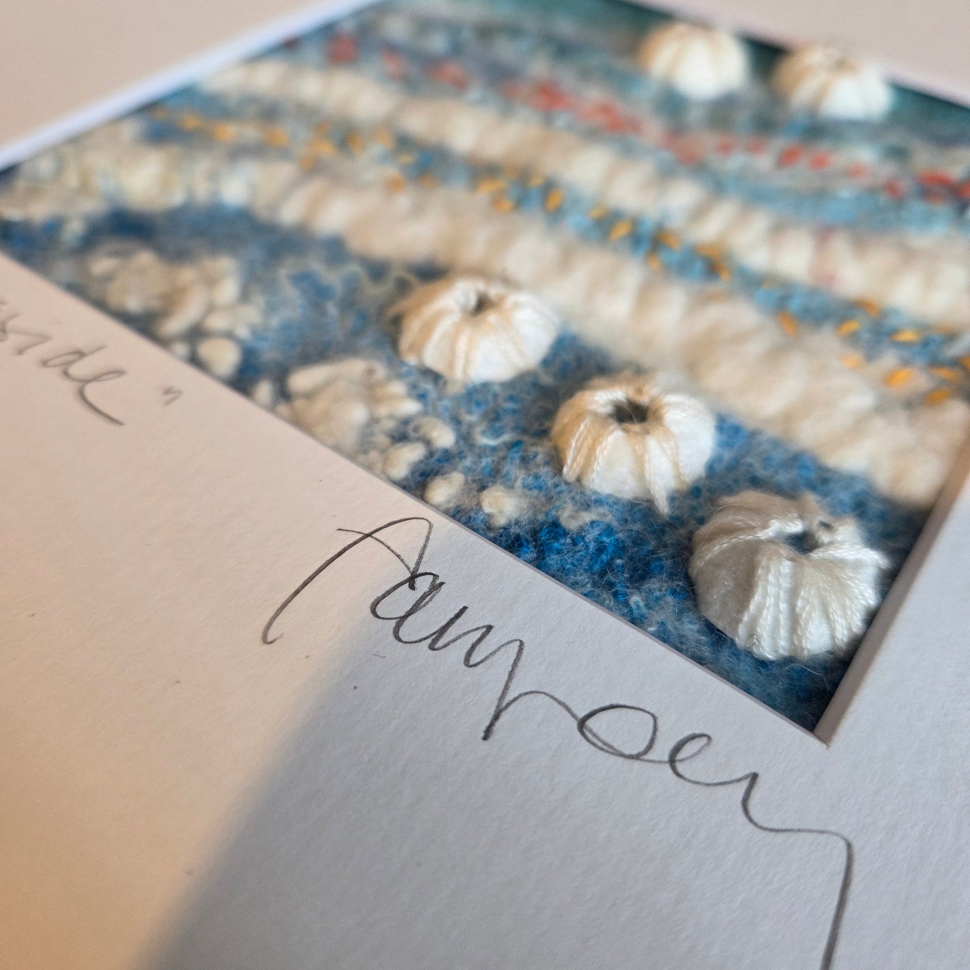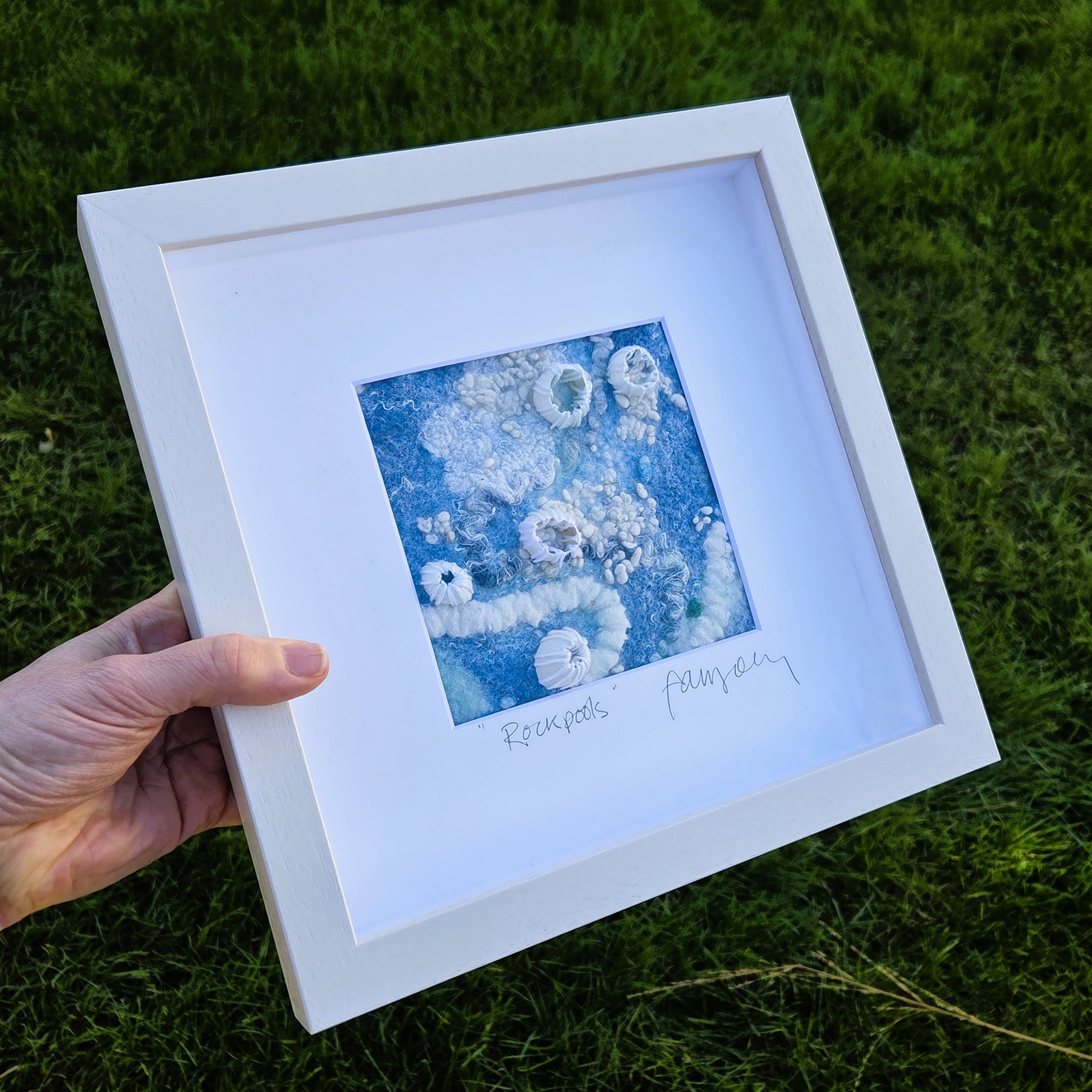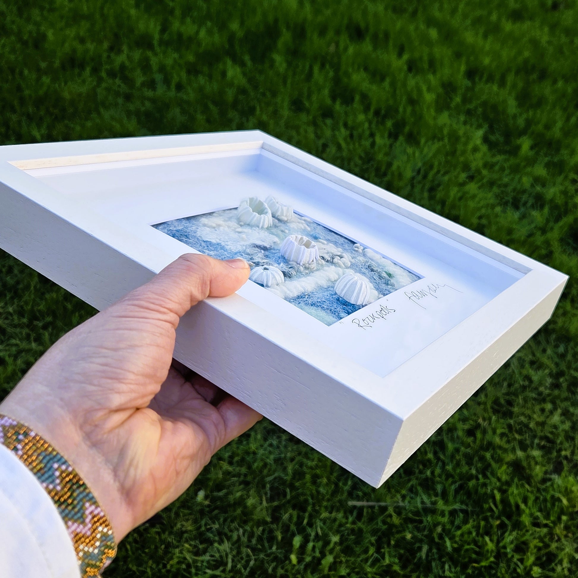 The inner landscape measures 12cm x 12cm, beautifully mounted and set within a white wood and glass Irish-made box frame (26cm x 26cm) allowing the 3 dimensional "barnacles" to be viewed — ready to hang or gift.