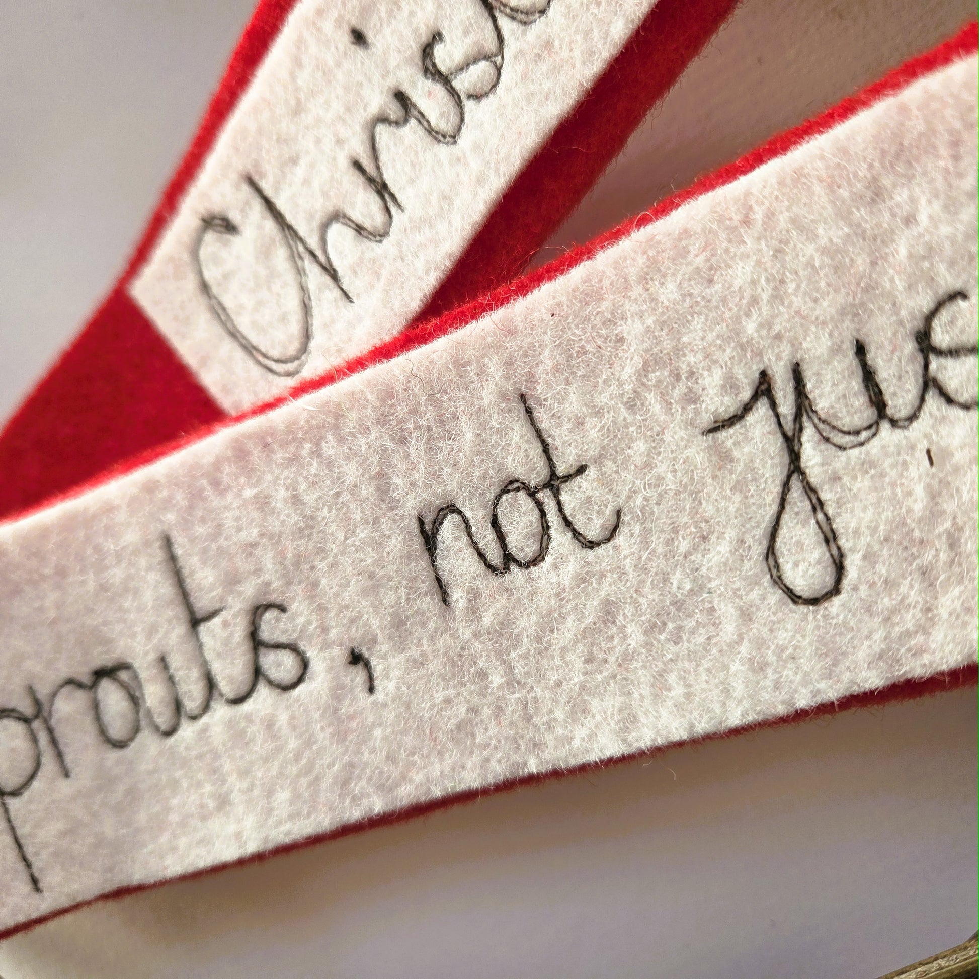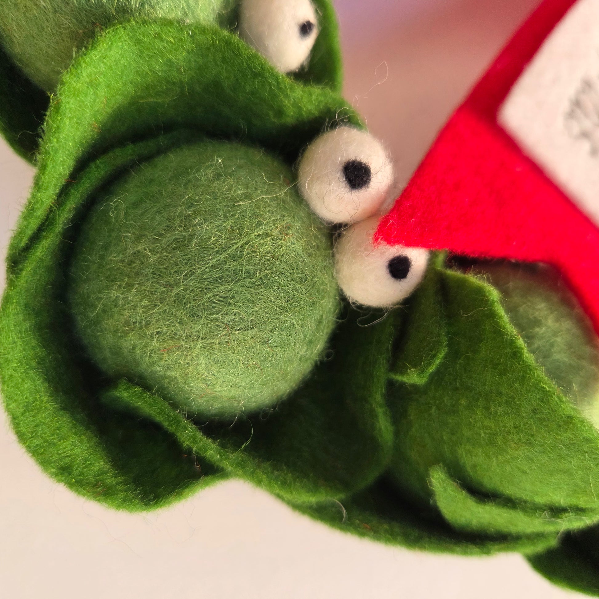 Adorned with five quirky handmade 100% wool “Brussels Sprouts” and embroidered with the words “Sprouts, not just for Christmas”, this wreath is a fun reminder to love your veggies all year long.