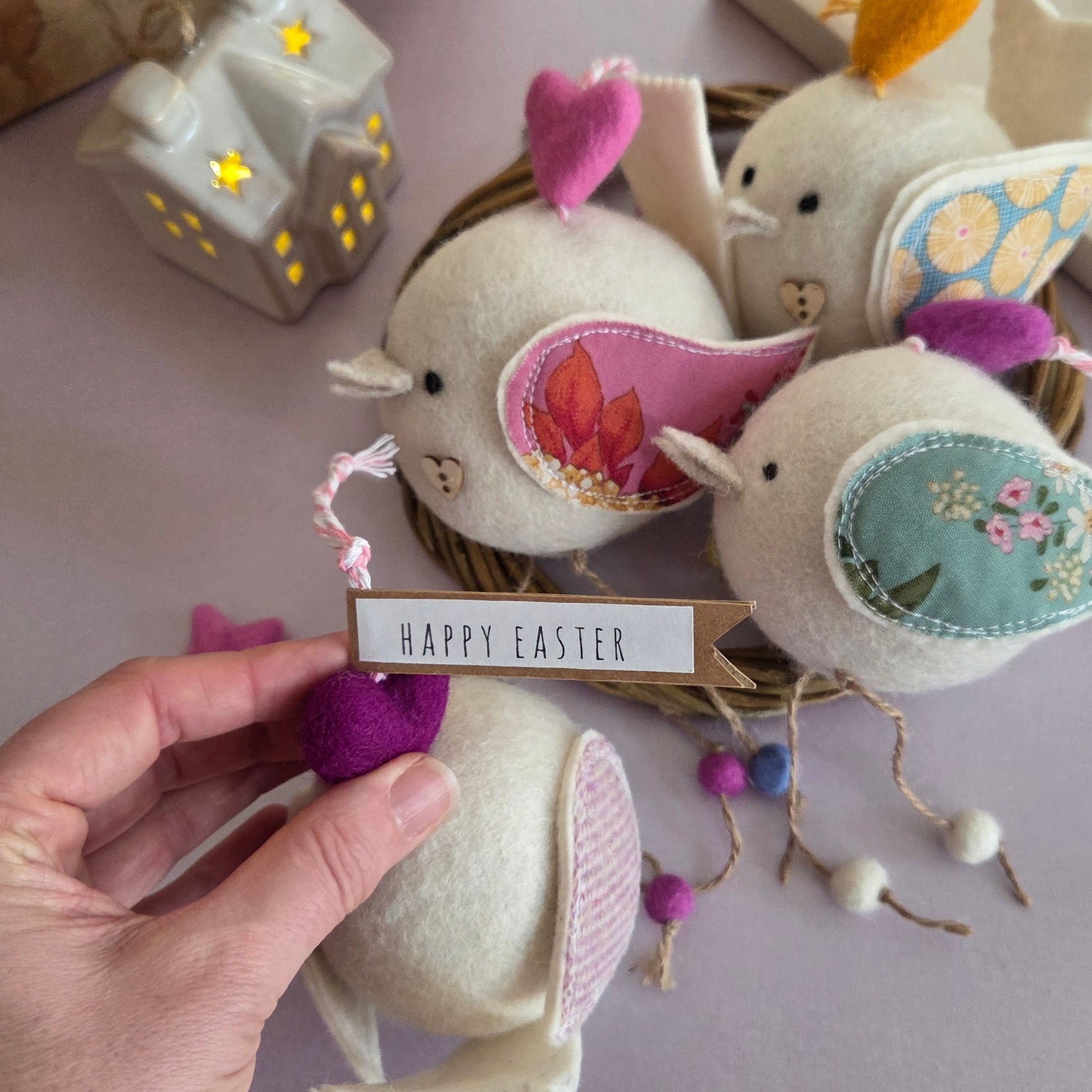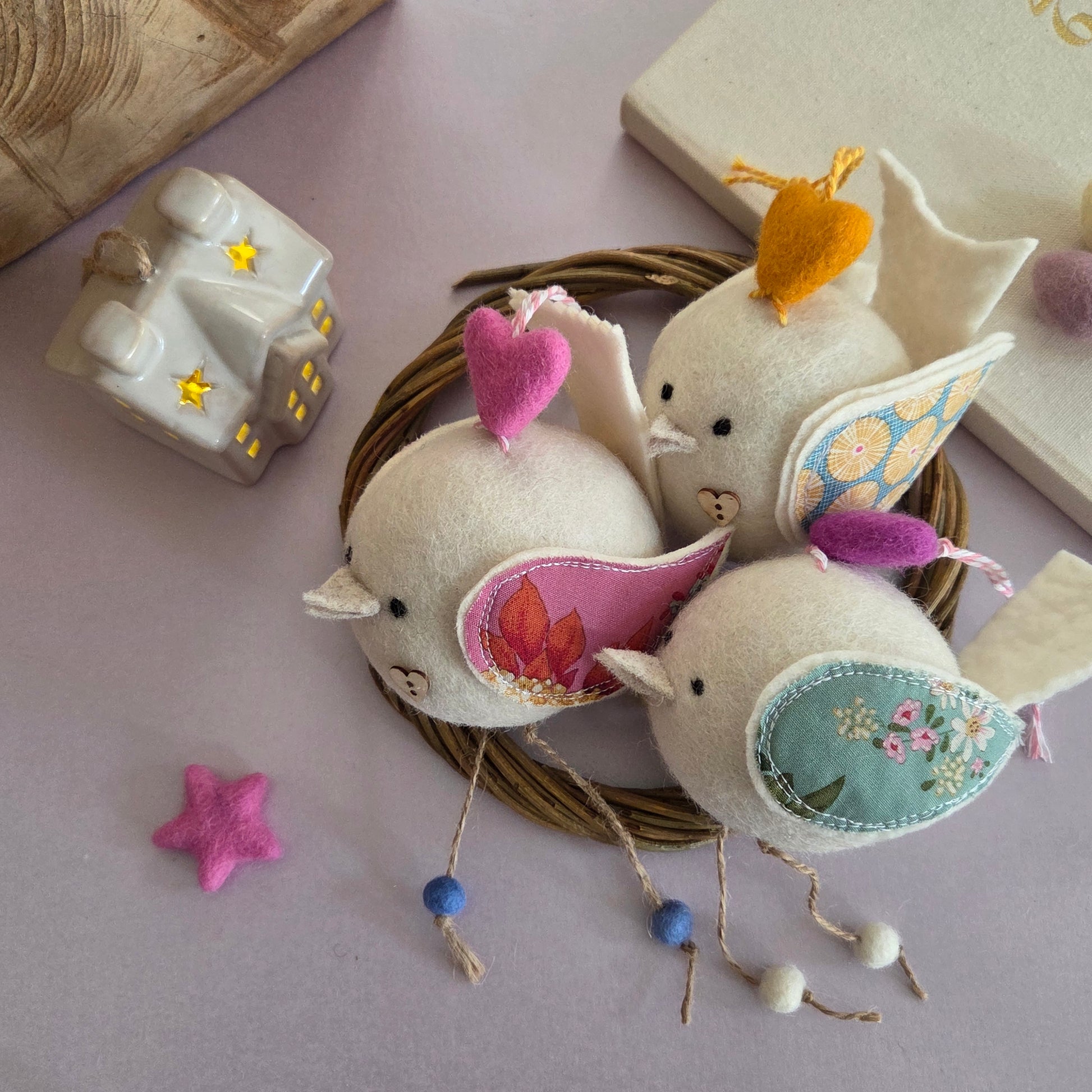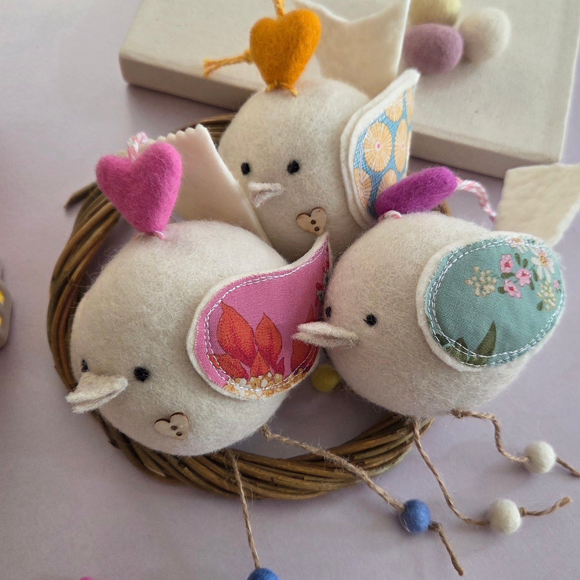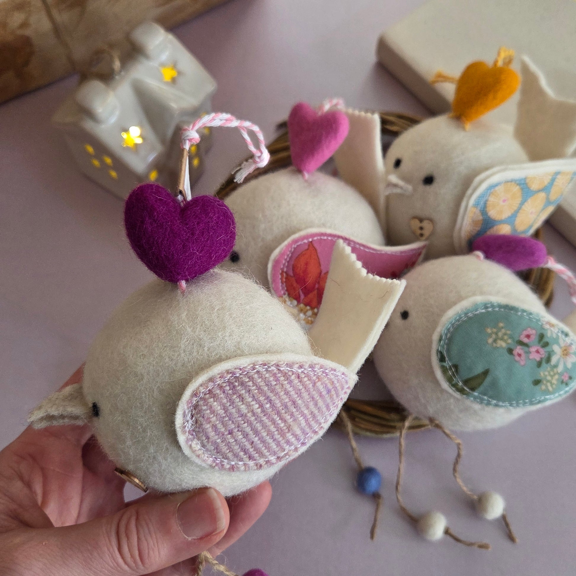 ( bird selected at random, I use "printed cotton from the Tilda range or McNutt of Donegal tweed for the wings, all in soft spring/Easter colourways).